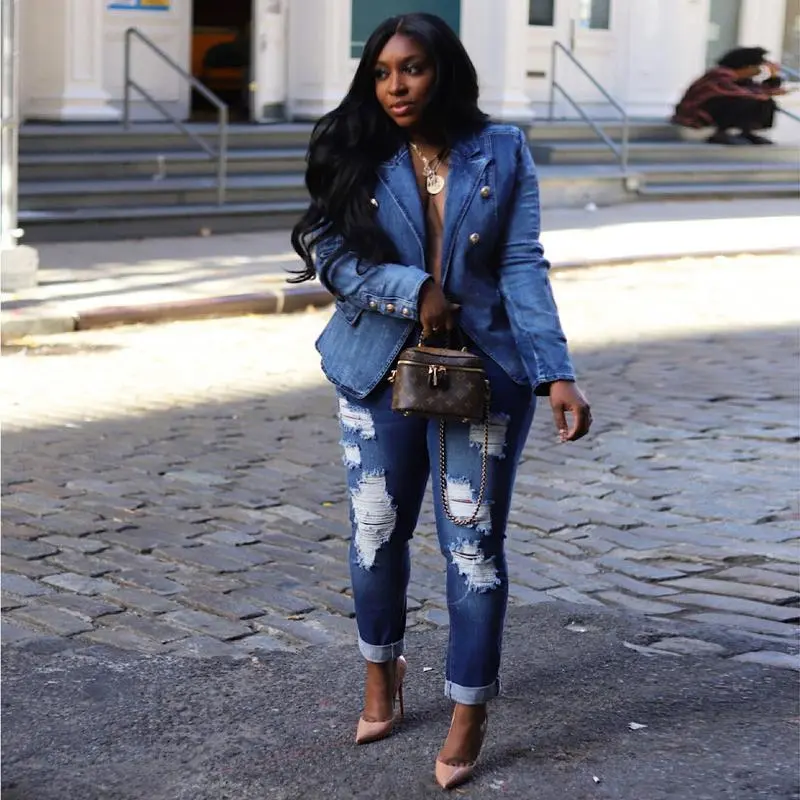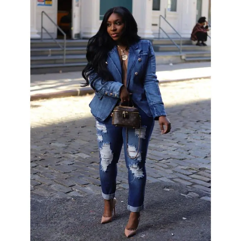 Pattern: solid color Style: slim fit Length: regular style (50cm Collar: suit collar Sleeve length: long sleeve Sleeve type: regular sleeve Popular elements: distressed Craftsmanship: patchwork/stitching Fabric name: denim Main fabric component: polyester (polyester fiber) Color: light blue, dark blue, black Size: S, M, L, XL, XXL Style type: private clothes celebrity Main fabric component 2: spandex Placket: one button Main fabric component content: 90% (inclusive) - 95% (exclusive) Style: celebrity style