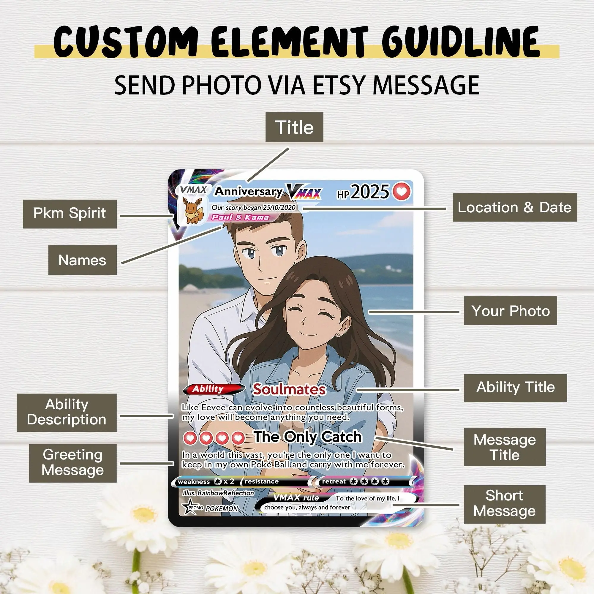 Please send your PERSONALIZATION via message: [photo] - Title - Names - Location & Date - Ability Description - Greeting Message - Short Message