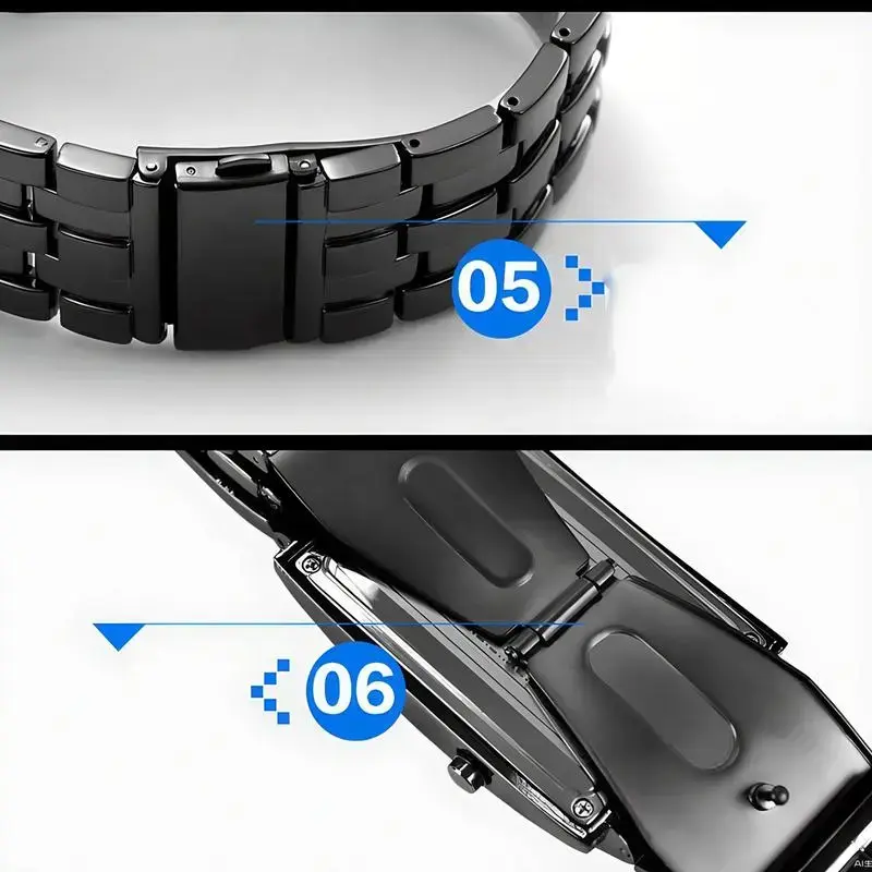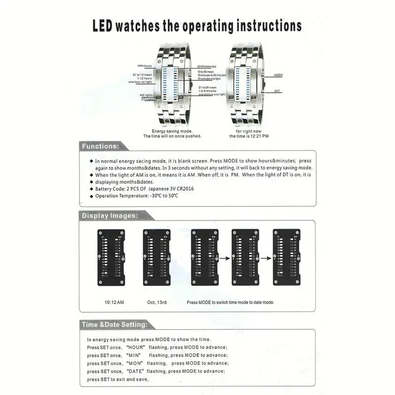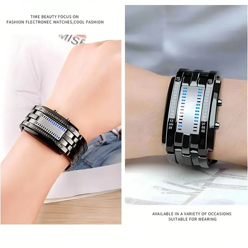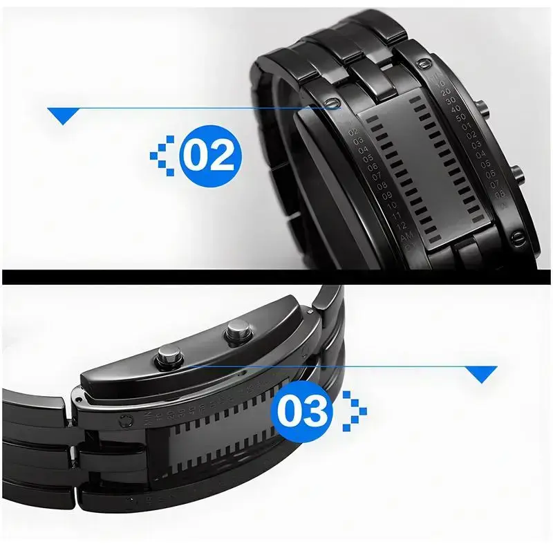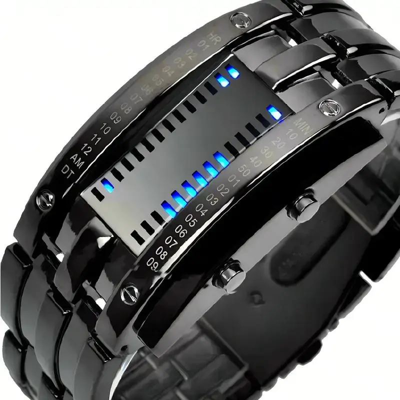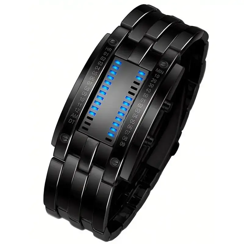 Men's Cool Binary Watch Stainless Steel LED Bracelet Watch Stylish Blue Light Sport Watch Vacuum plated black