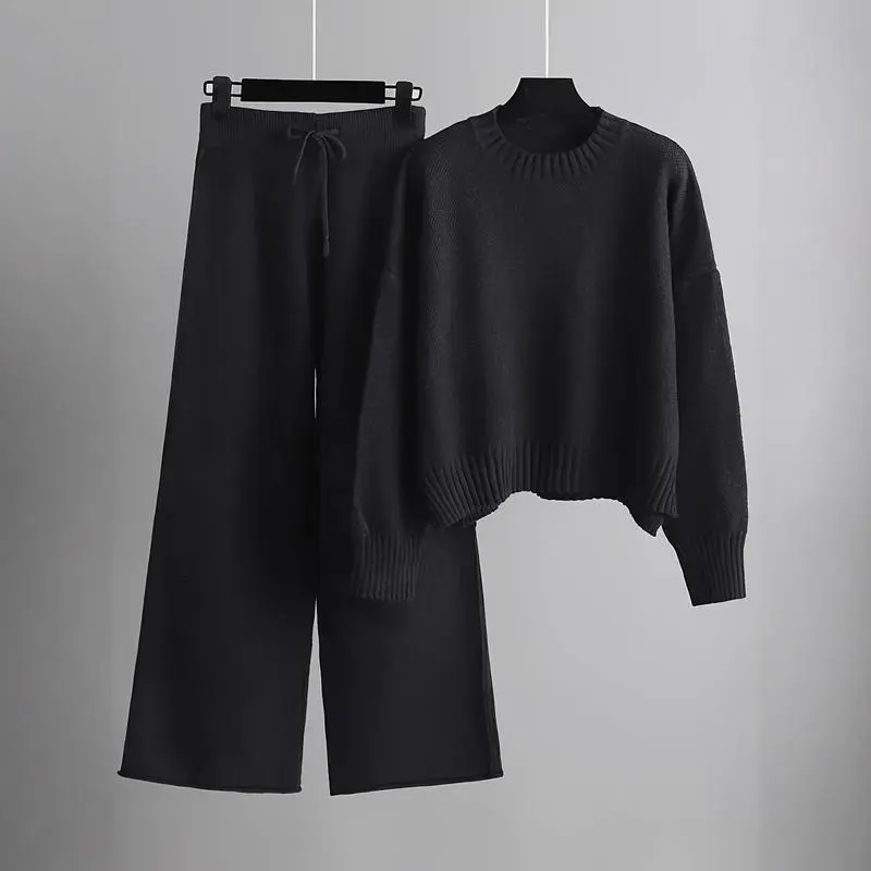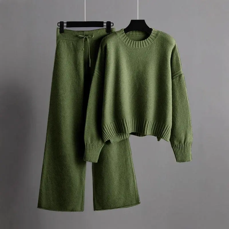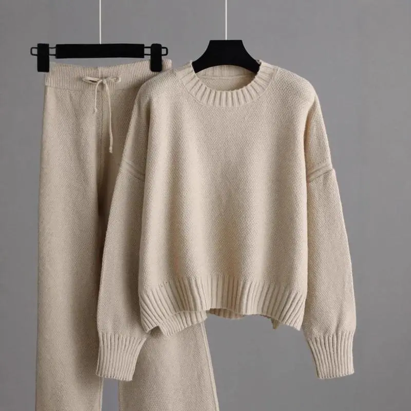Women's Oversized Round Neck Sweater & Wide-Leg Pants Two-Piece Set , Drop Shoulder Long Sleeve Pullover with Ribbed Texture, Loose Fit Trousers for Fall Winter Warmth, Women 2 Piece Sweater Outfits