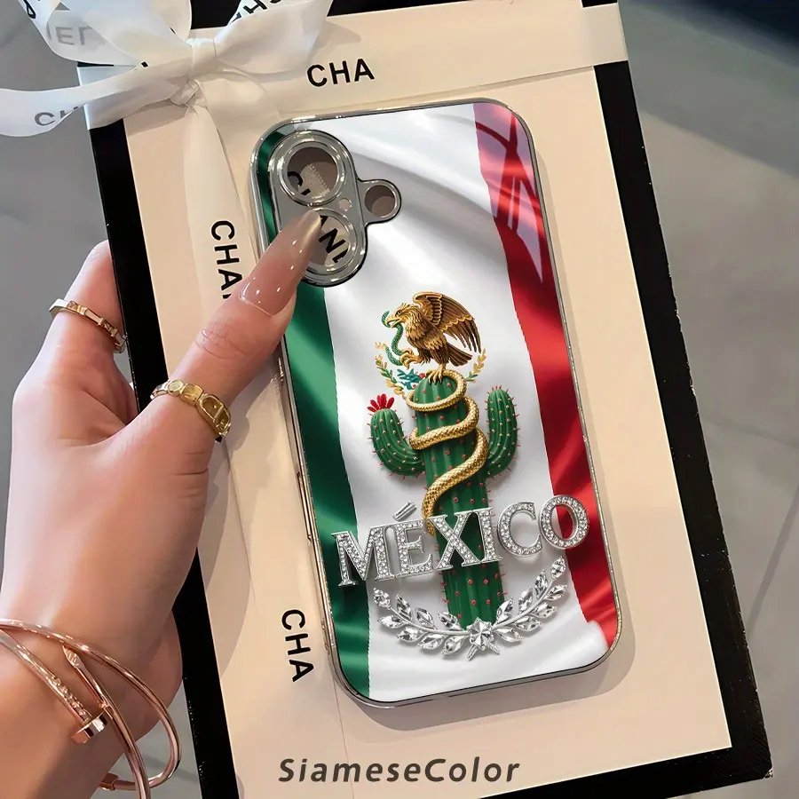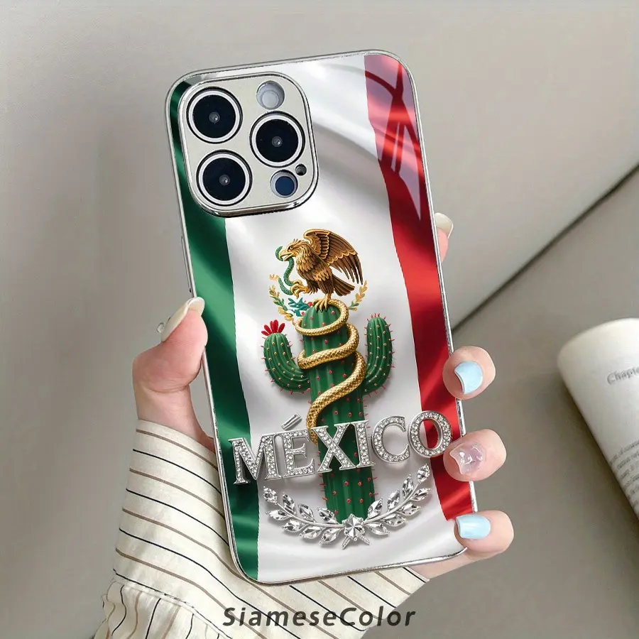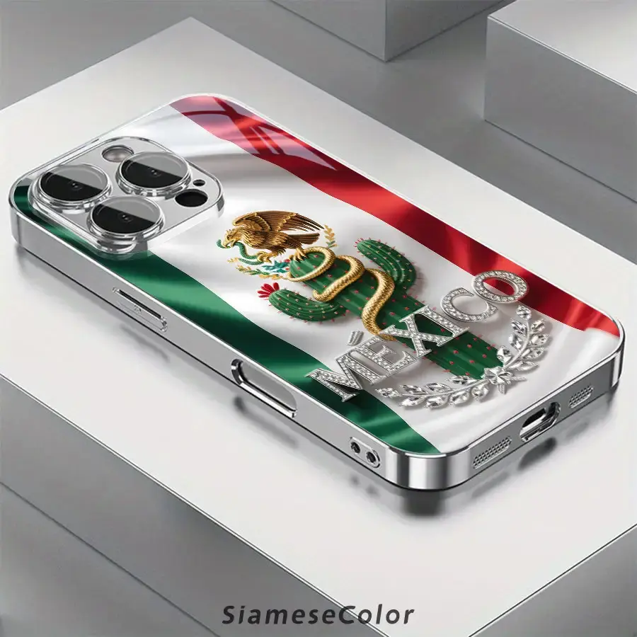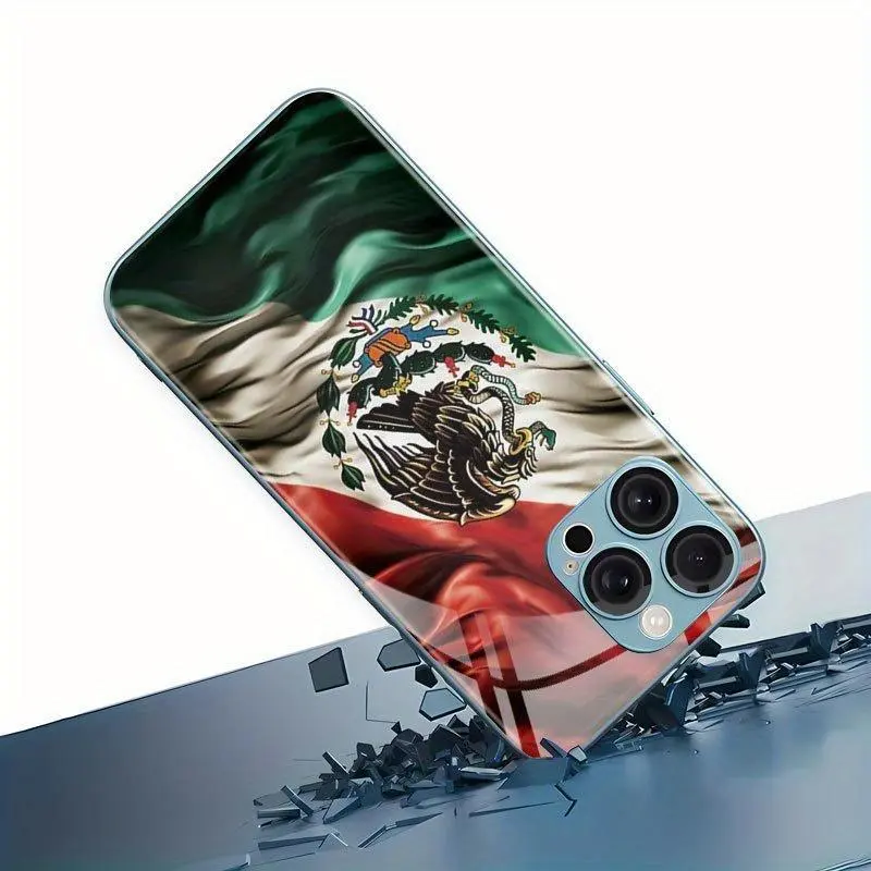 Exquisite 2D Pattern Mexican Flag Diamond Badge Glass Phone Case, Suitable for iPhone 17 16, 15, 14, 13, 12, 11 Plus Pro Max
