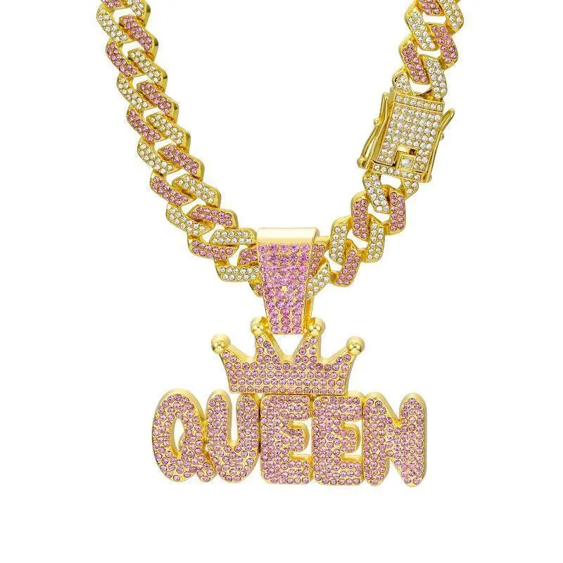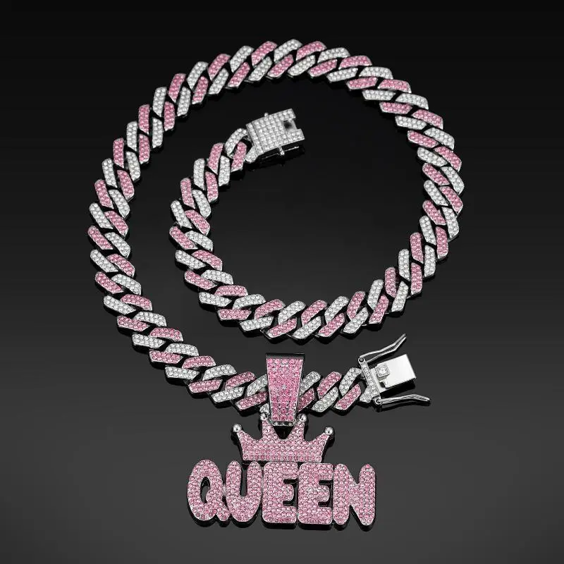 Women Pink Rhinestone Crown QUEEN Letter Hanging Miami Cuban Link Chain Necklace Long Hip-hop Jewelry Punk Accessories