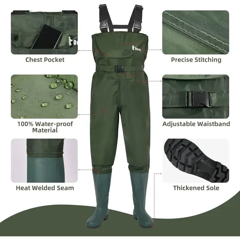 Ouzong chest waders are perfect for fishing, hunting, camping, farming, or any messy situations. 100% Waterproof Fabric Nylon-reinforced PVC material provides premium waterproof performance. The seams of the fishing waders are glued, stitched and taped for great durability and waterproofness, insulating icy water to keep warm, dry and comfortable. High-quality waist belts with quick-release buckles can be adjusted according to your height and body. Enhanced toe protects against impacts from above. Thickened soles can protect your feet from scratching by sharp rocks in the deep waters. The free boot hanger is equipped with high-strength ABS plastic buckles and a 360-degree revolving hook, perfect for drying and storage fishing waders. The waterproof phone pouch ensures your phone or other small parts stay dry. Help to enjoy a host of water activities with no worries. Kids Chest Waders Kids Chest Waders Fishing Hip Waders Fishing Hip Waders 3-Ply Chest Waders Add to Cart Add to Cart Add to Cart Add to Cart 4.4 out of 5 stars 4.4 out of 5 stars 4.4 out of 5 stars 4.4 out of 5 stars 4.0 out of 5 stars — no data US 4/5, 6/7, 8/9, 10/11, 12/13 T US 4/5, 6/7, 8/9, 10/11, 12/13 T 4mm Neoprene Booties Wader Hanger+Phone Case Wader Hanger+Phone Case
