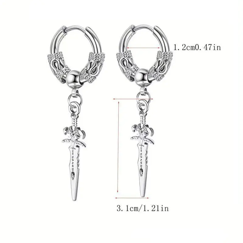 2pcs Stainless Steel Dragon Coil Sword Pendant Drop Hoop Earrings Unique Punk Hip Hop Style for Men Women Daily Wear Jewelry