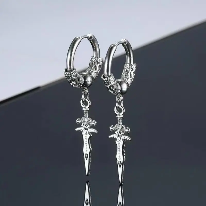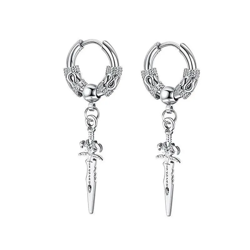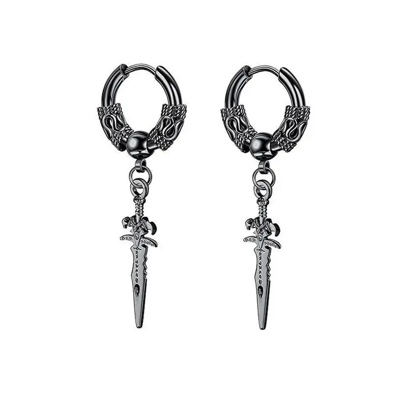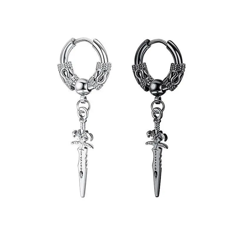 2pcs Stainless Steel Dragon Coil Sword Pendant Drop Hoop Earrings Unique Punk Hip Hop Style for Men Women Daily Wear Jewelry/100% New fashion jewelry/Item Type: Earrings/Color: Silver,Black/Material: Stainless Steel/Size: as the picture/Package includes: 2pcs Earrings/Note:/1.There might be a little color difference according to different light,different monitor.So if dear you can not accept this very little difference, be cautious before you making the orders./2.As close-up take the pictures, pictures has been enlarged, Detailed dimensions please see the item description.