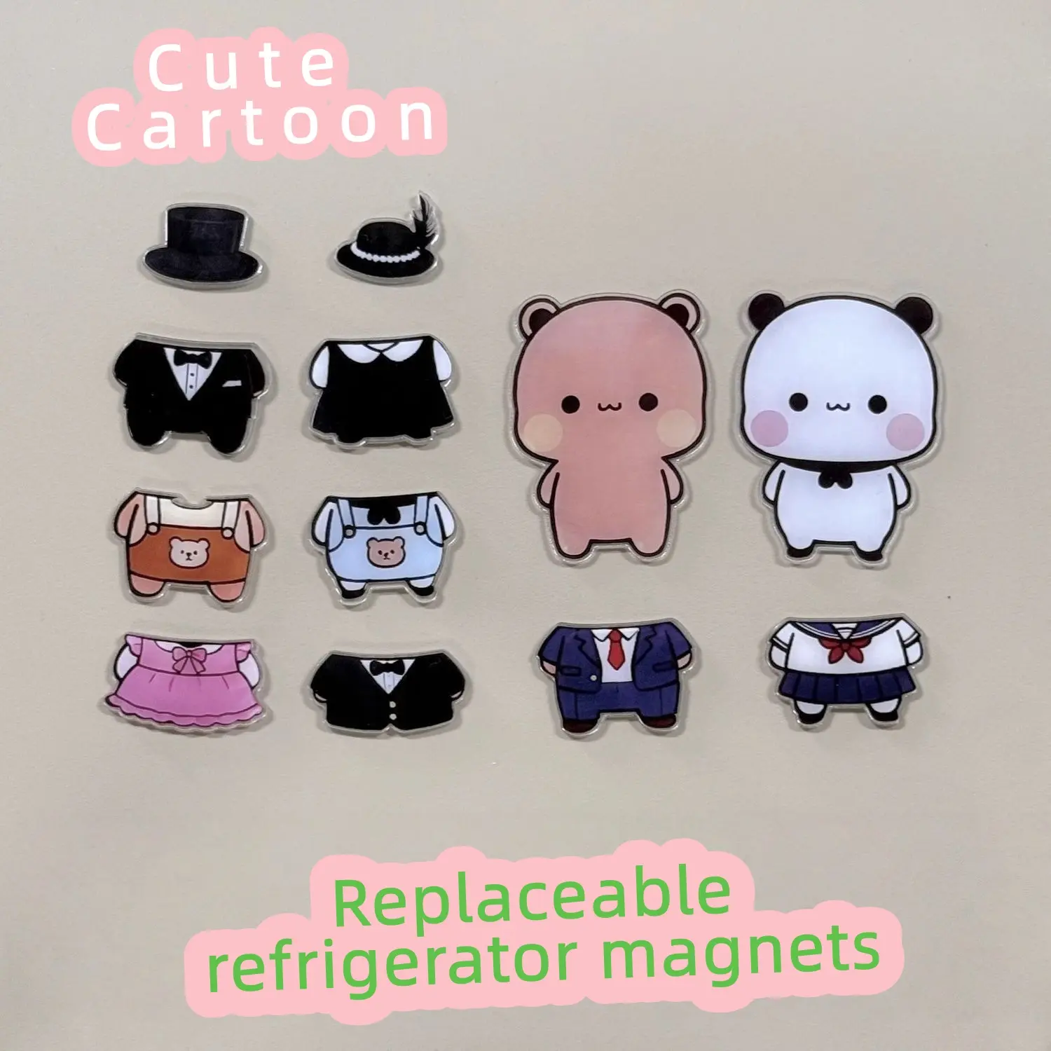The cutest magnetic dress-up set for your fridge or locker! Includes 2 adorable bear-panda characters and 8 mix-and-match magnetic outfits: formal suits, school uniforms, dresses, and more. Swap styles in seconds—perfect for daily mood updates. Strong magnets stick to any metal surface 8 clothing pieces + 2 hats for endless combinations Couple-themed designs, great for gifting Character size: 3" tall High-quality acrylic with UV printing ️ Small magnetic parts—keep away from children under 14. Not a toy