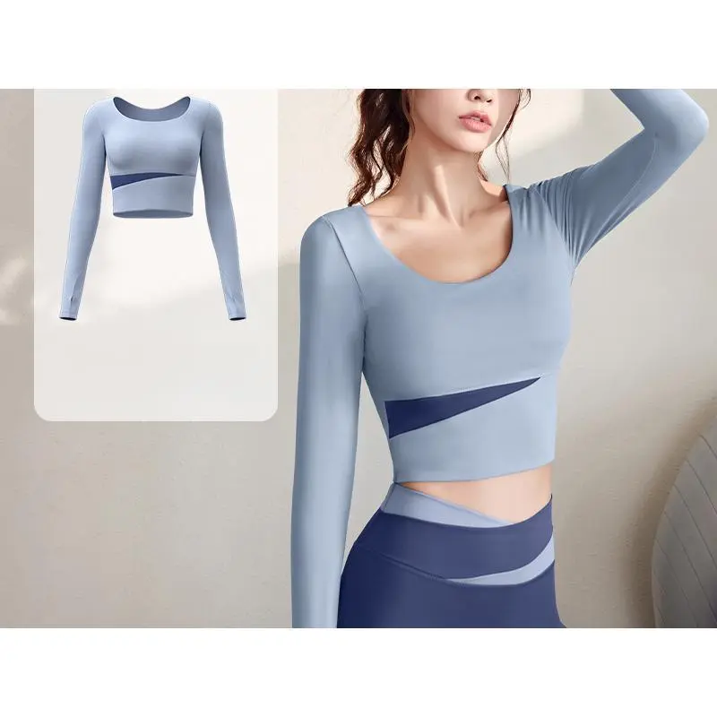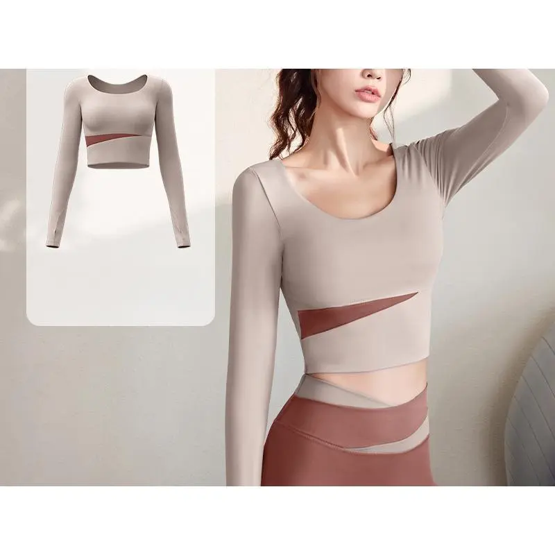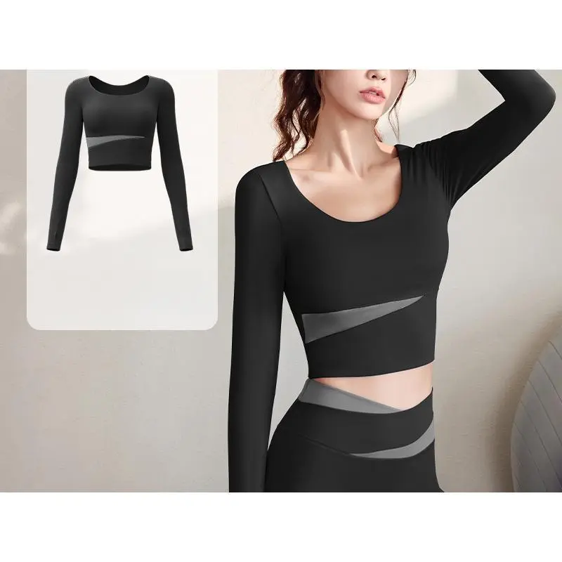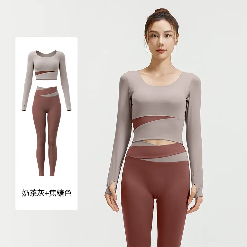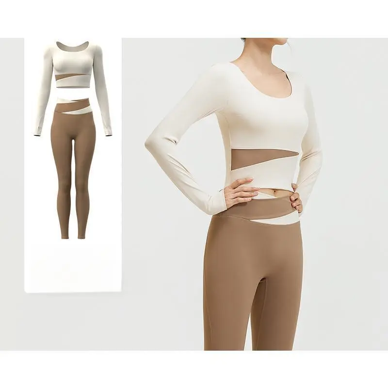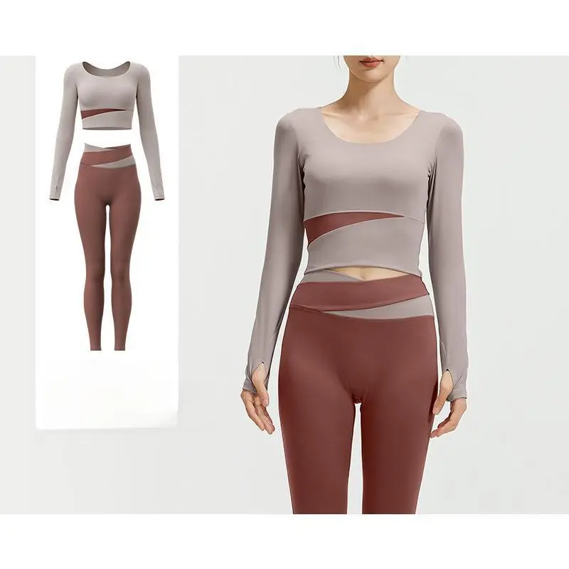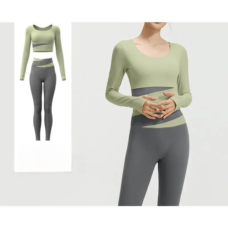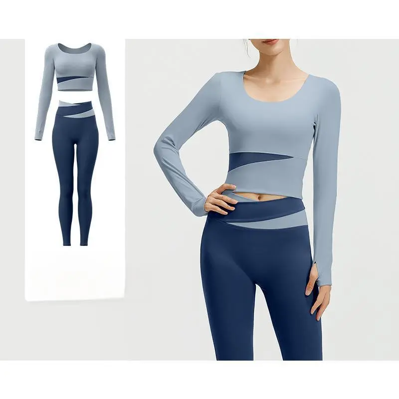 Color Block Long Sleeve Yoga Suit Set Bare Sensation Tight Slimming Sports Running Fitness Set for Women