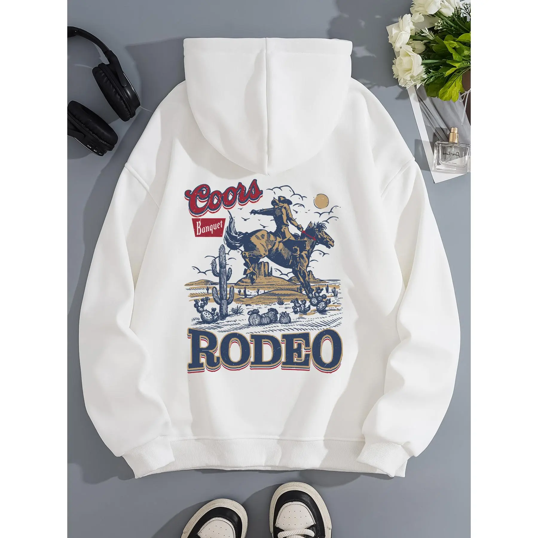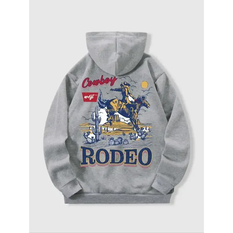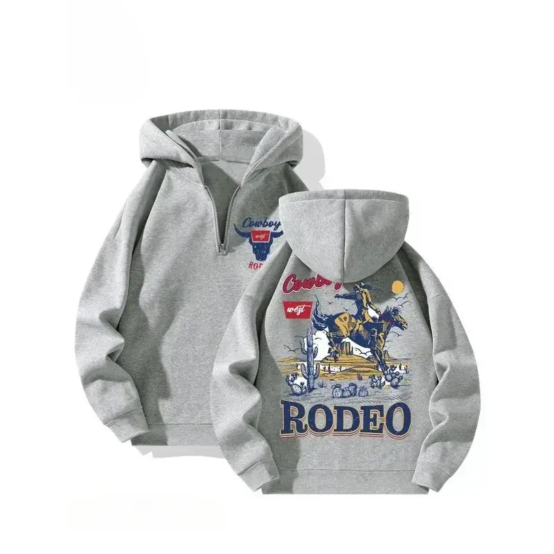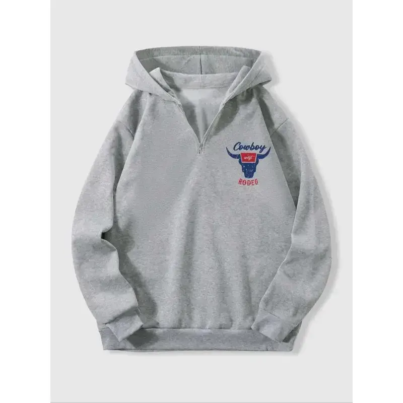 Men's Spring Fall Winter Fleece Hoodie, Fitted, Western Cowboy Print, Half Zip Design, Casual Streetwear, Retro Style, All Seasons