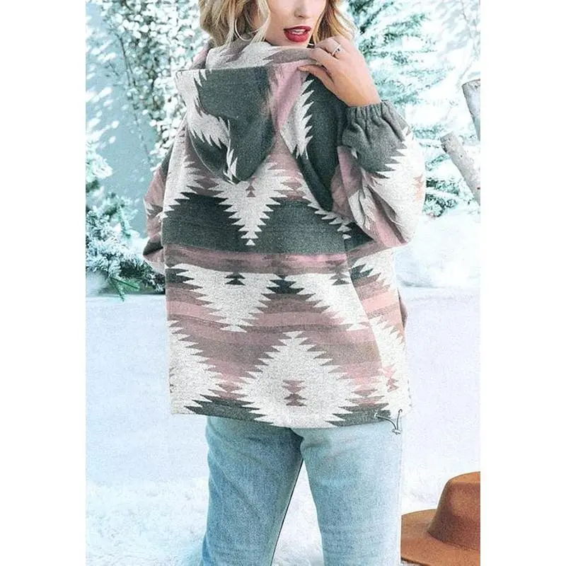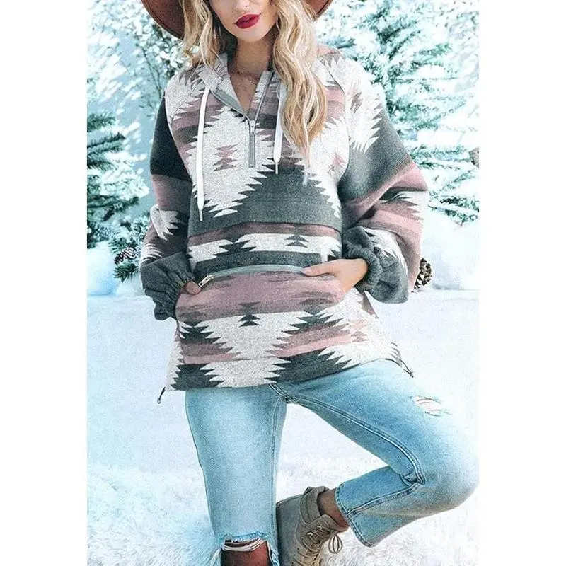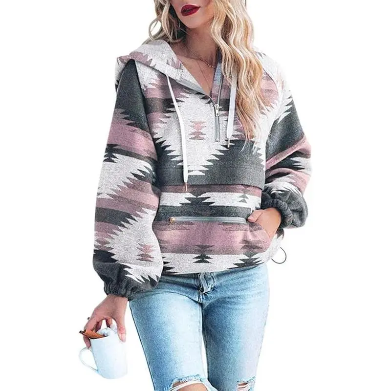 Women's Tribal Aztec Print Hooded Half Zip Fuzzy Fleece Hoodie Sweatshirt Tops