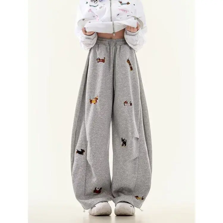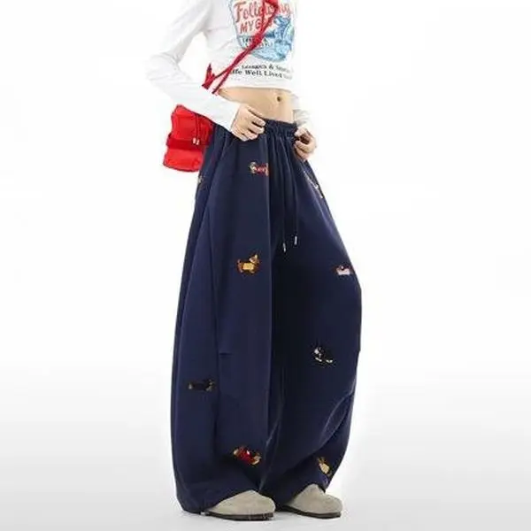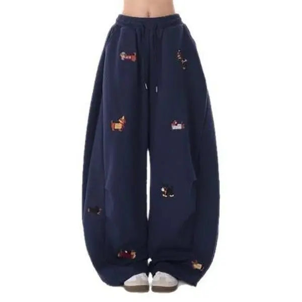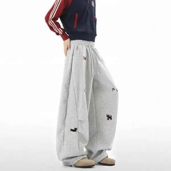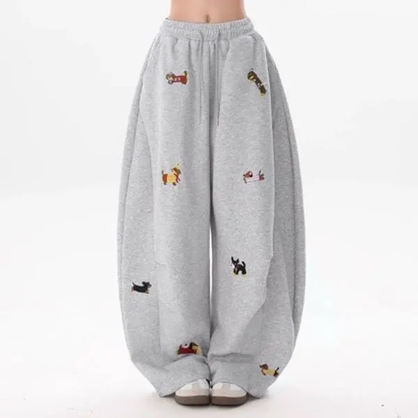 Women’s Lazy Style Embroidered Dog Drapey Straight Curved Wide-Leg Pants