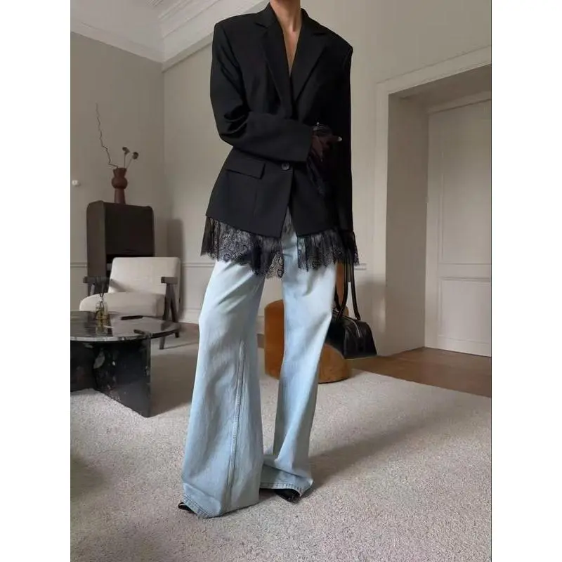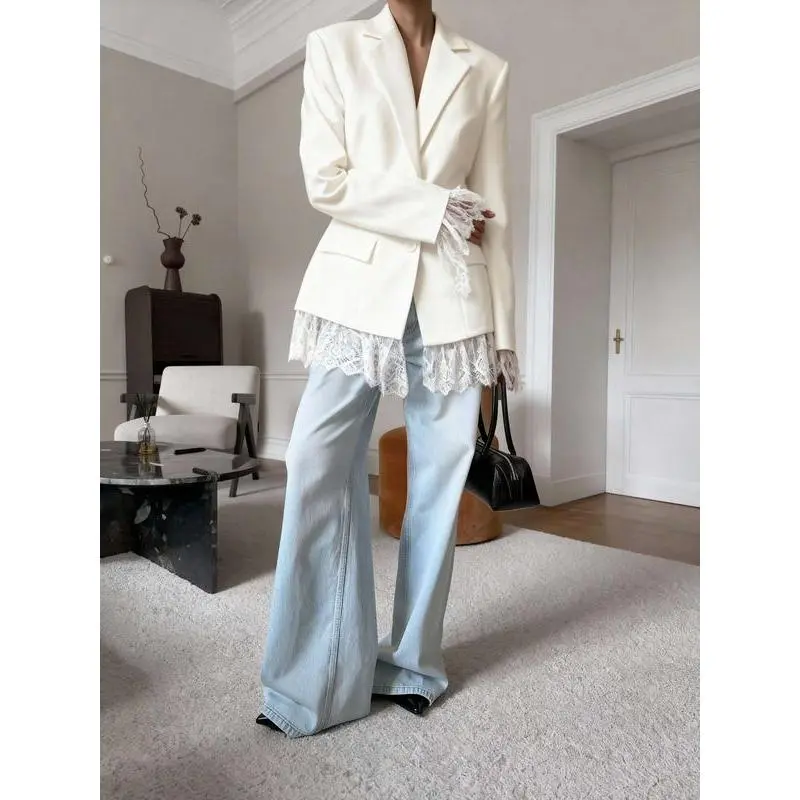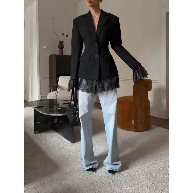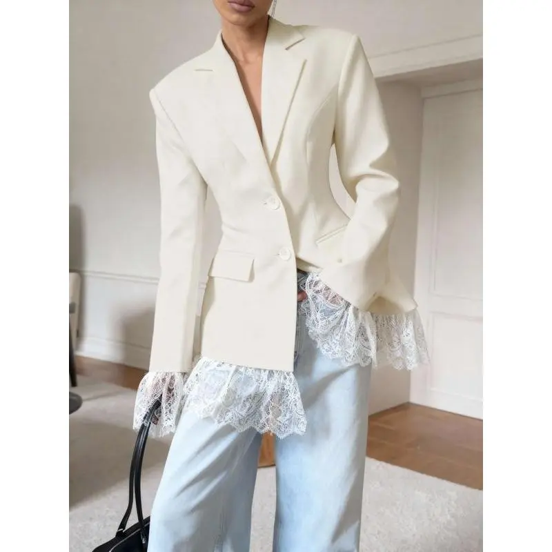 【Lace Contrast】: Features a unique contrast lace insert, adding a distinctive touch to this classic tailored jacket. 【Fitted Silhouette】: The fitted shape of this blazer enhances body contours, offering a sophisticated and structured appearance. 【Button Closure】: Equipped with button closures, this blazer allows for easy wear while maintaining a polished look. 【Functional Pockets】: Includes practical pockets that offer convenient storage solutions while retaining a sleek profile. 【Seasonal Versatility】: Designed for both spring and fall, this blazer is suitable for a range of occasions across different seasons.