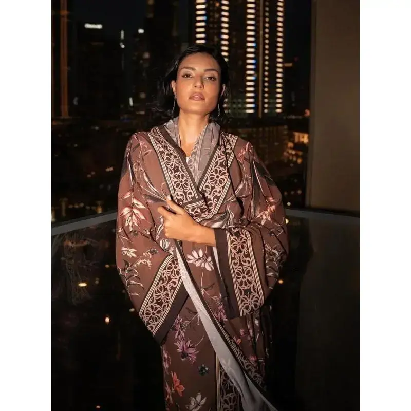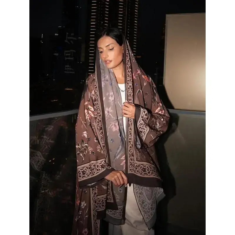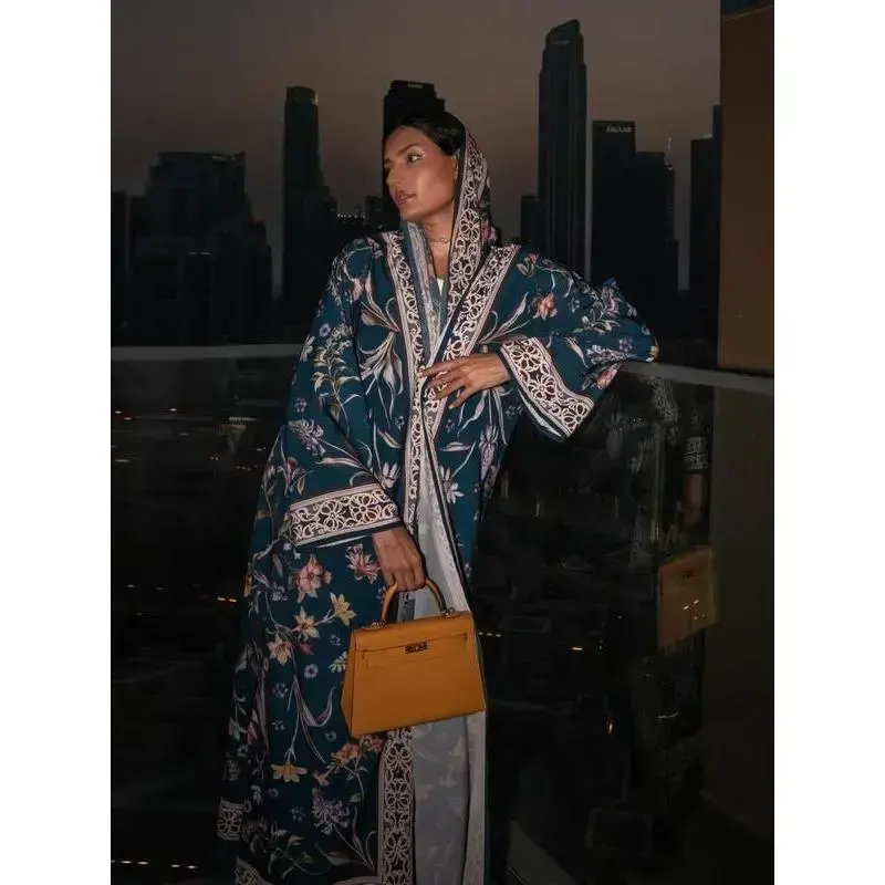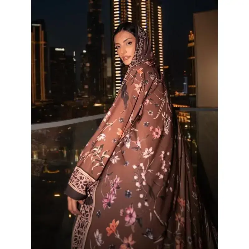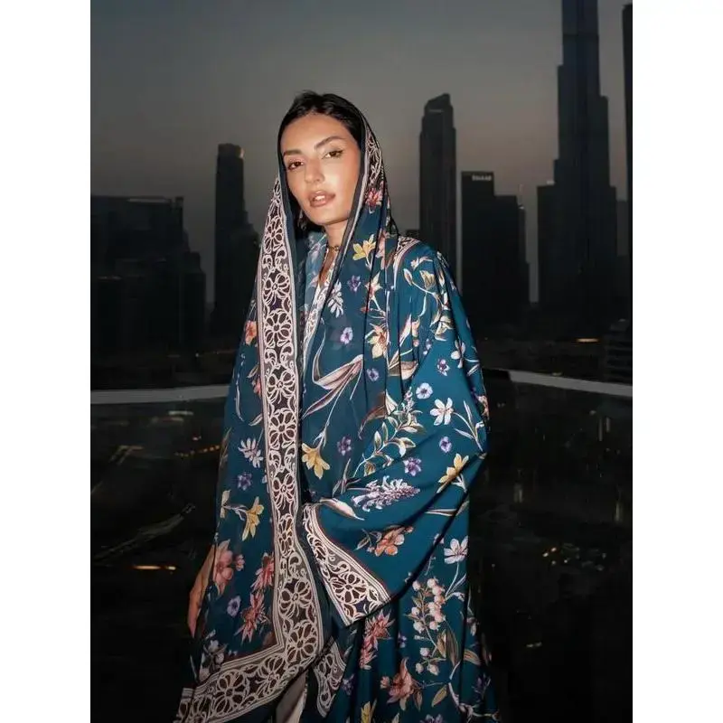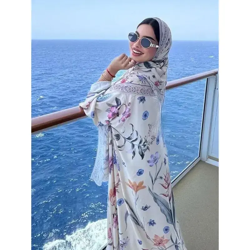 Muslim Women's Abaya Set with Hijab, Elegant Simple Floral Print Long Robe Jacket, Casual Party Beachwear, All Seasons Wear
