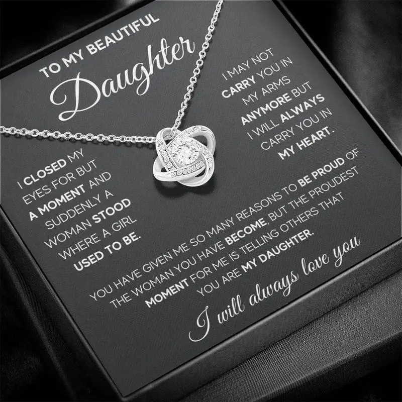 To My Daughter, If there is ever a tomorrow when we're not together, there is something you must always remember... You're braver than you believe, stronger than you seem, smarter than you think, and loved more than you know. Always keep me in your heart because you're always in mine. Nothing and nobody, not even time, will change that. I will always love you!/TIMELESS KEEPSAKE GIFT: Our jewelry comes with a premium quality gift with a special message. This piece makes a unique and thoughtful necklace gift for your daughter. Includes gift box./INSPIRATIONAL MESSAGE CARD: Message Card Jewelry represents an unbreakable bond between two souls. This symbol of eternal love is a forever favorite and trending everywhere. Surprise your loved one with this gorgeous gift today! It is not a small item but a big surprise for your daughter!/MATERIALS & SIZE: Pendant size: 1.2" x 1.5" (30mm x 39mm) Adjustable cable chain 18" - 22" Easy to use lobster clasp/14k white G plated finish over stainless steel/7mm cubic zirconia/Pendant dimensions: 0.8" (20mm) height / 0.4" (10mm) width/Adjustable length: 18" - 22" (45.72 cm - 55.88 cm)/Lobster clasp