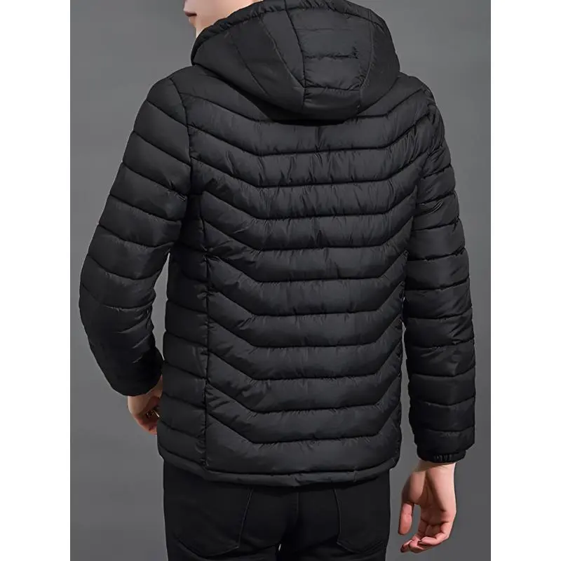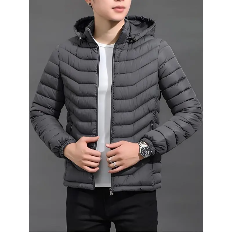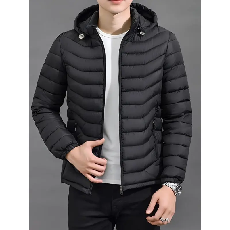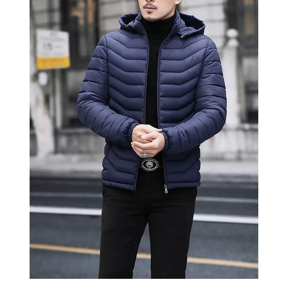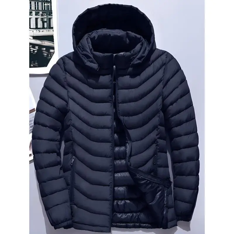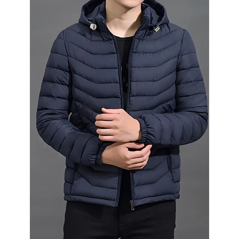 Fashion men's wear?? Men's Elegant Hooded Winter Coat - Full-Zip Insulated Jacket with Removable Hood, Padded Windproof Windbreaker, Polyester Insulation & Zippered Pockets, Navy Blue Casual Outerwear for Cold Weather (Hand Wash/D