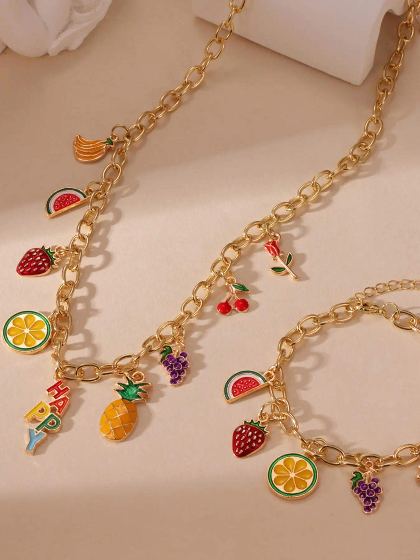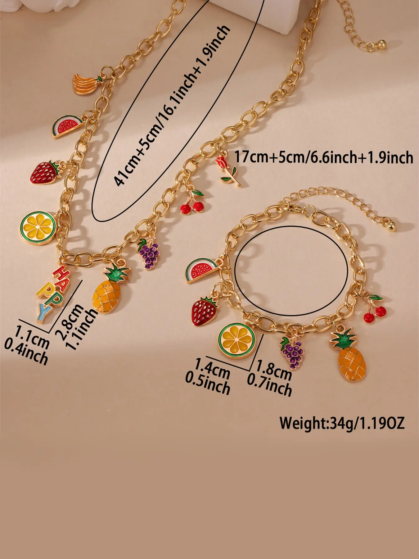 Women's Fruit Necklace Bracelet Set, Watermelon Strawberry Cherry Design, Elegant Summer Jewelry Accessories for Women & Girls