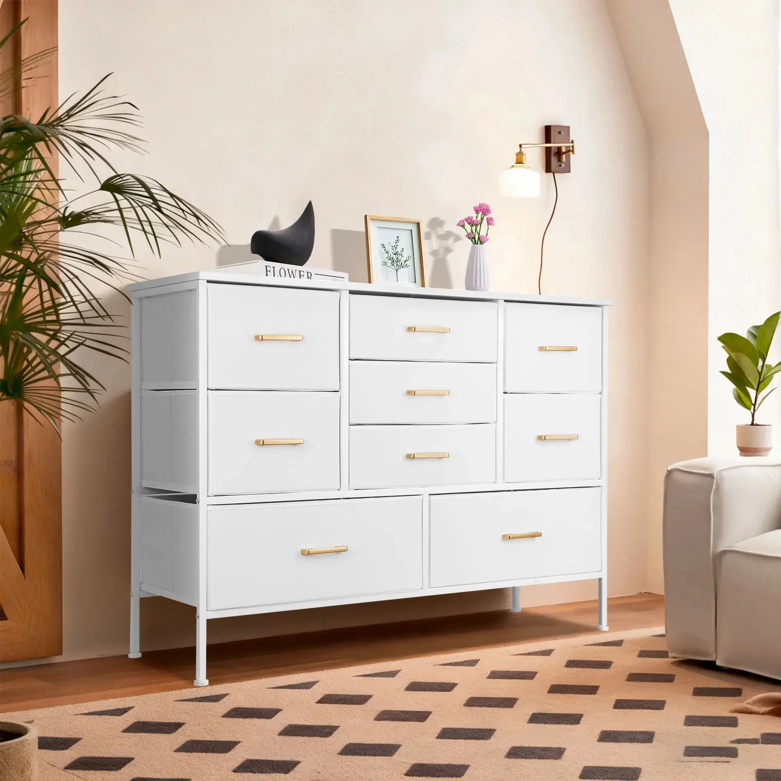 SICANDAENHK Maximize space with this stylish 9-drawer fabric storage tower!Slim tall chest of drawers with durable fabric bins offers large capacity for clothing, blankets, accessories and baby items.Clean white finish fits any decor, ideal for bedroom