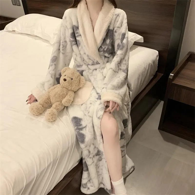 Women's Pajamas Cute Pijama Winter Sleepwear Warm Robe Sets Long Home Wear Bathrobe Plus Velvet Warmth Coral Fleece Nightgown Loungewear Womenswear