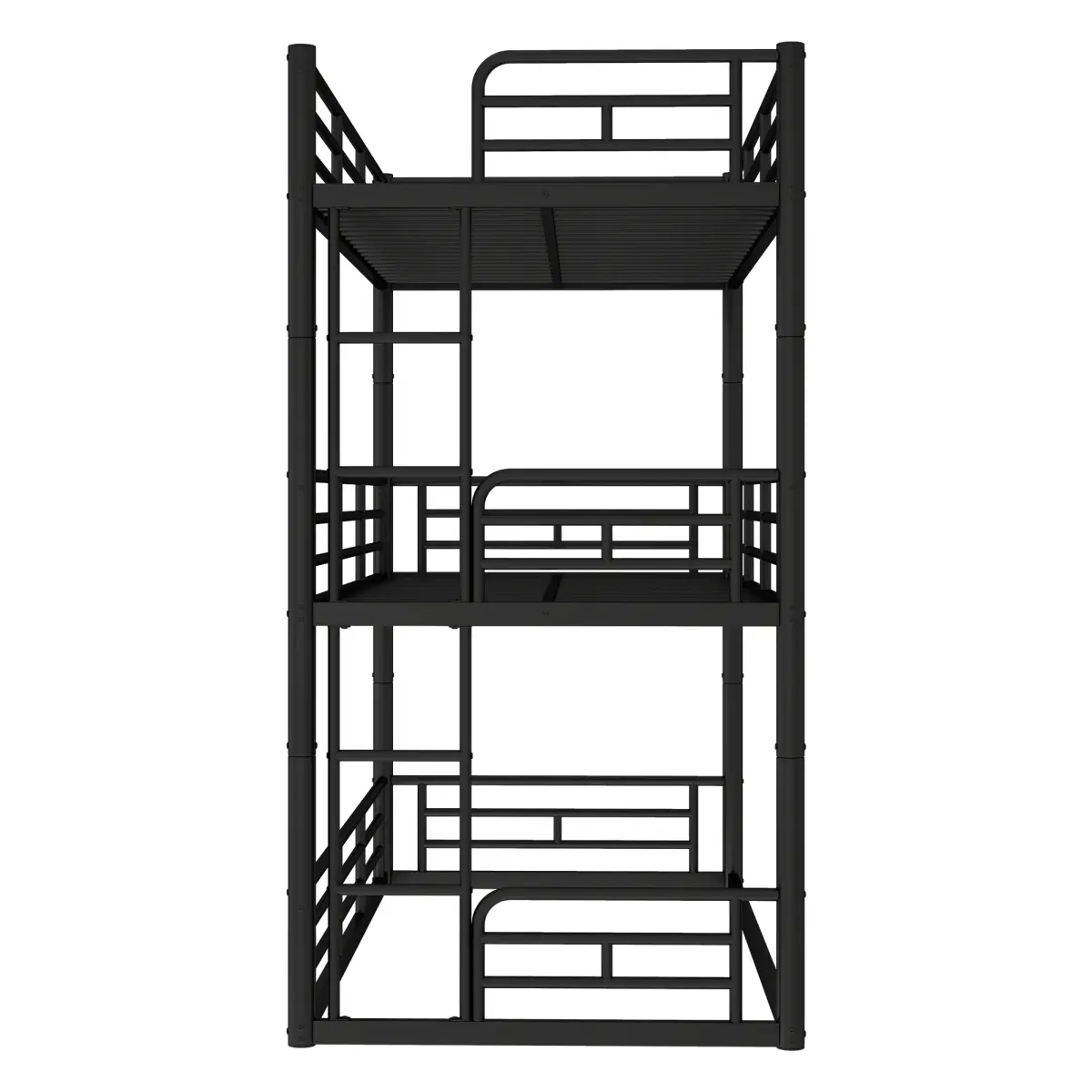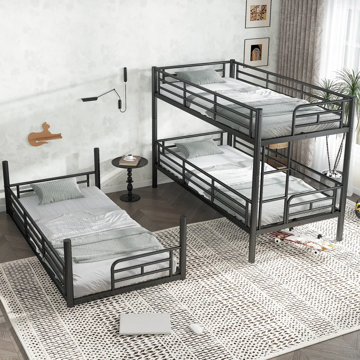 Crafted from a heavy-duty metal frame, this triple bunk bed ensures long-lasting durability and can support multiple sleepers with ease.Full-length safety guardrails on all sides of the upper bunks keep kids and teens safe throughout the night, making it a great bunk bed for kids or guests.