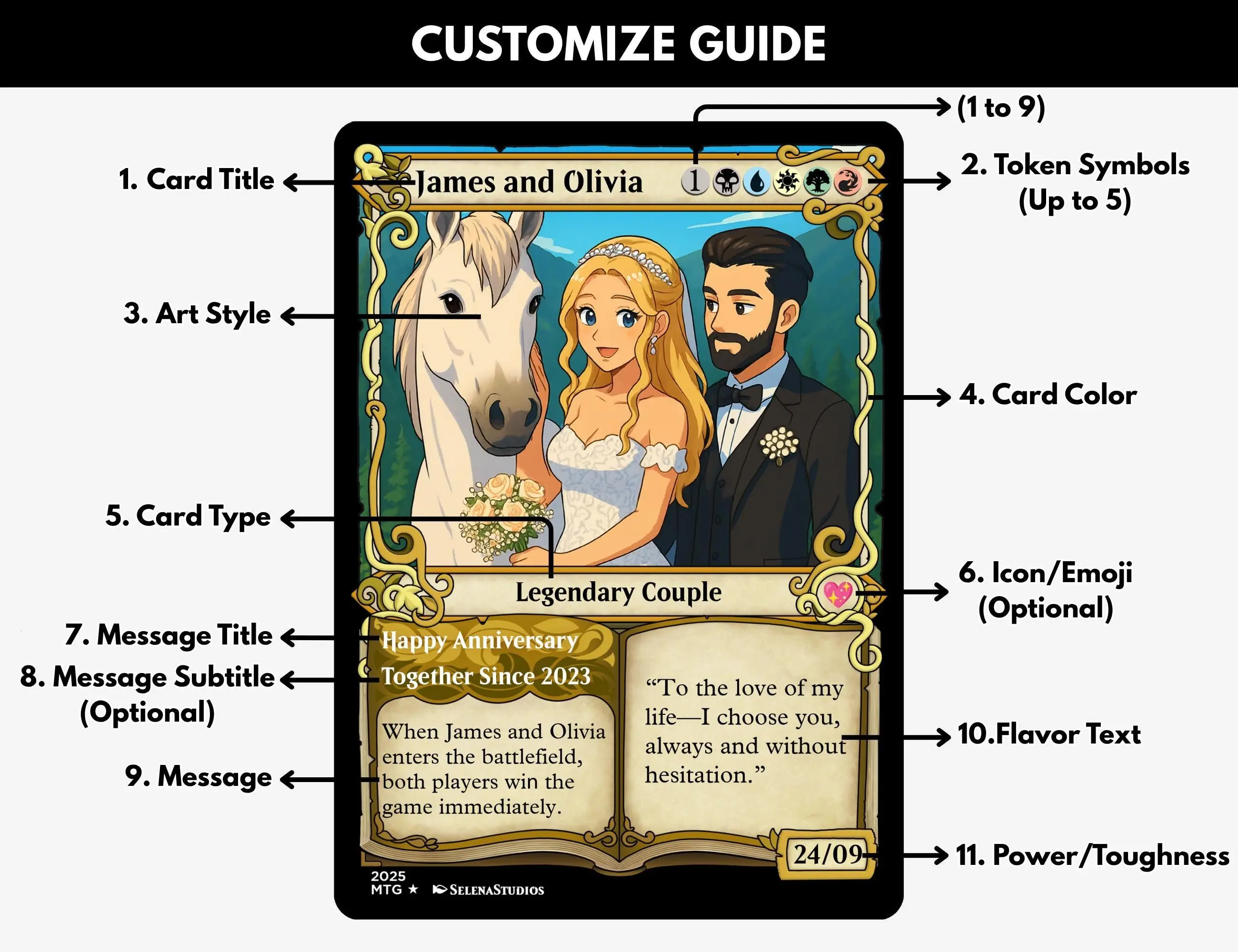 Please send your PERSONALIZATION via message: [photo] - Title - Names - Location & Date - Ability Description - Greeting Message - Short Message