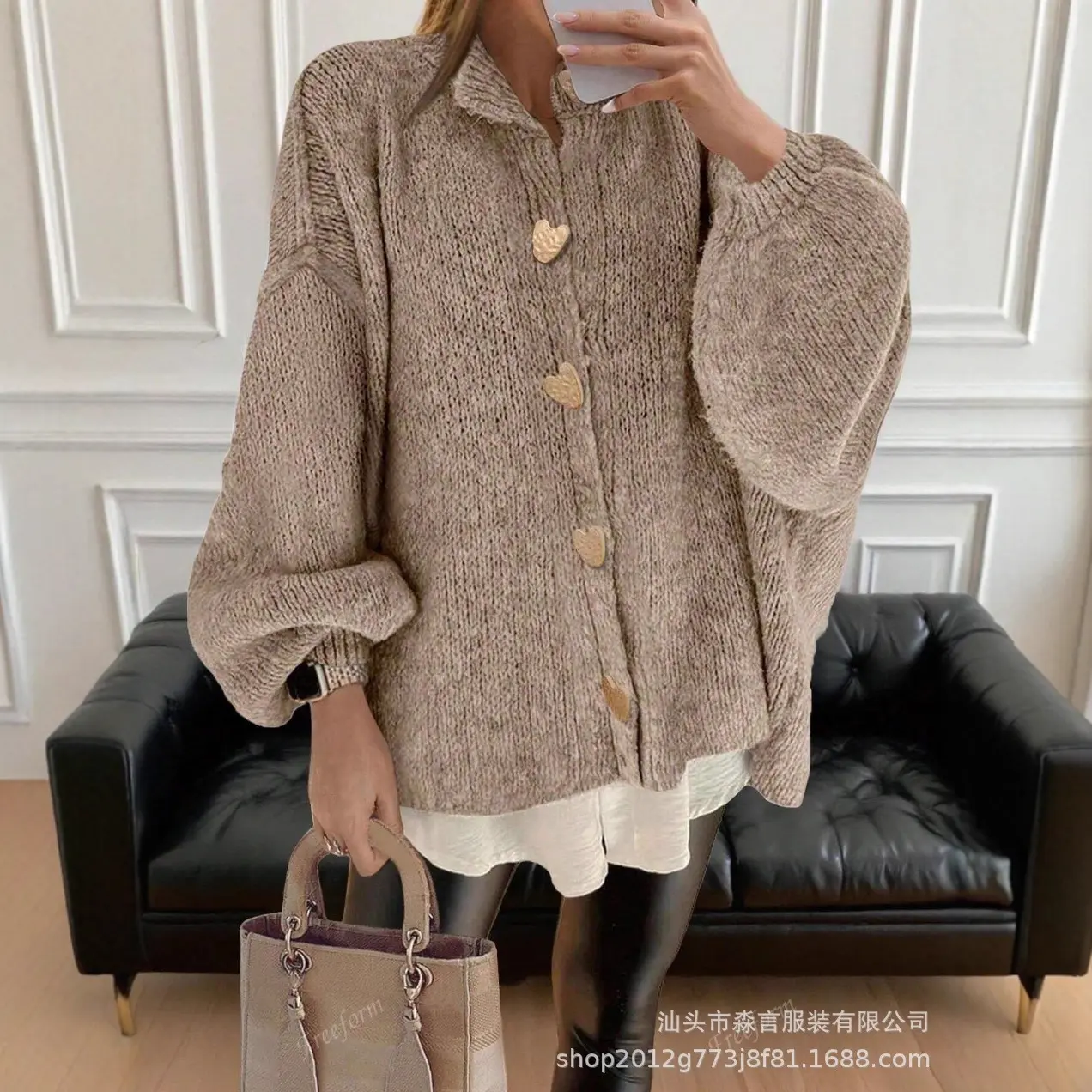 Valentine's Day Vintage Sweater Cardigan for Women, Fall Winter Casual Knit Outerwear, Heart Button Design, Loose Round Neck, Elegant Style