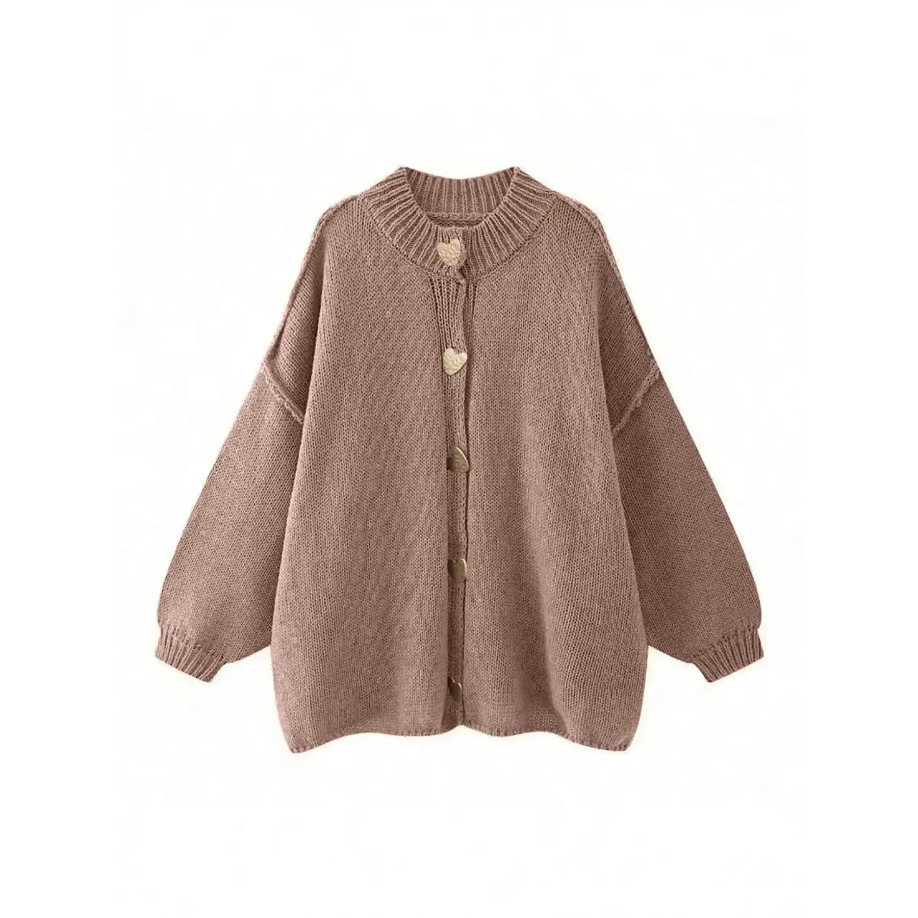 【Heart Button Details】: Features distinctive heart-shaped buttons that add a unique element, setting it apart from typical cardigans. 【Loose Fit】: Designed with a loose fit, allowing unrestricted movement, enhancing the wearer's experience during various activities. 【Metallic Accents】: Incorporates metal buttons, providing a contemporary touch and elevating the overall aesthetic of the cardigan. 【Seasonal Use】: Crafted for fall and winter wear, suitable for layering and providing warmth during colder months. 【Minimalist Pattern】: Constructed with a plain pattern, ensuring it pairs easily with various outfits, enhancing its usability throughout your wardrobe.