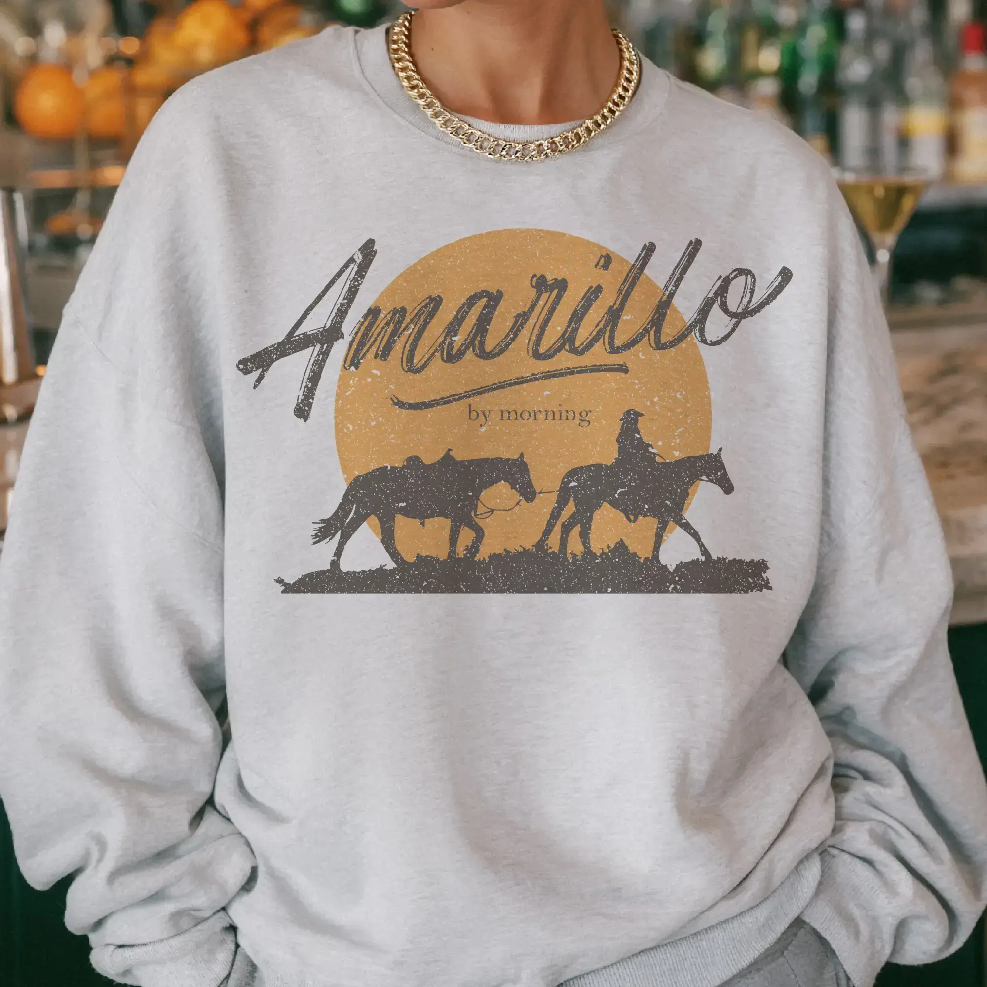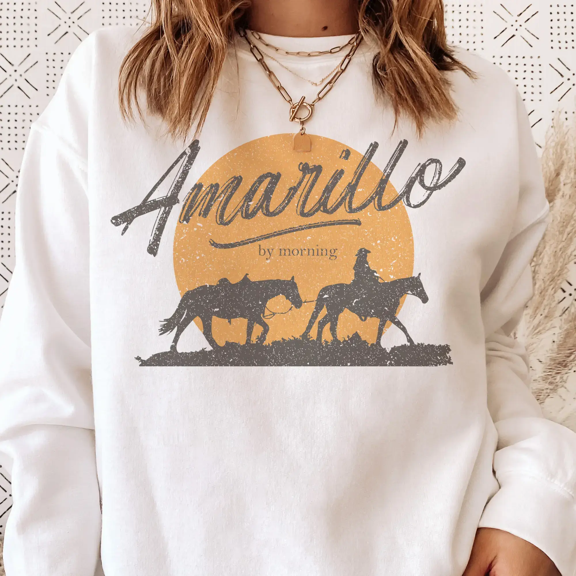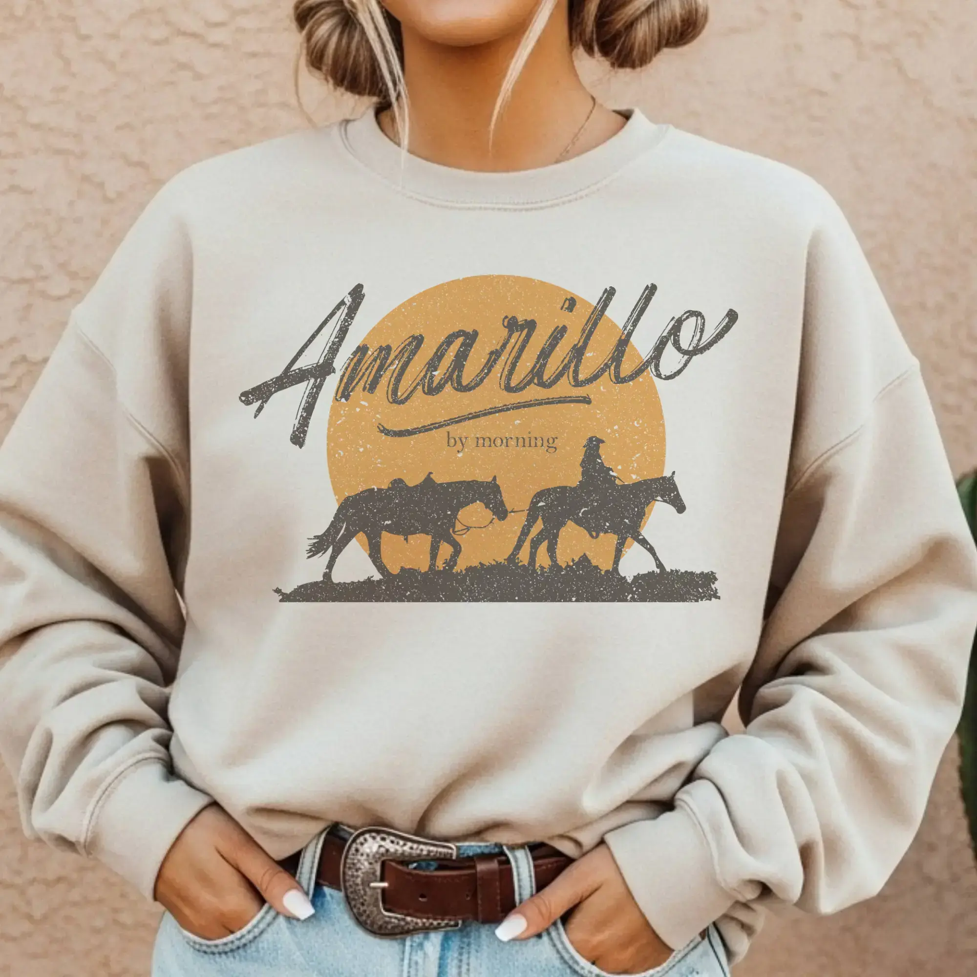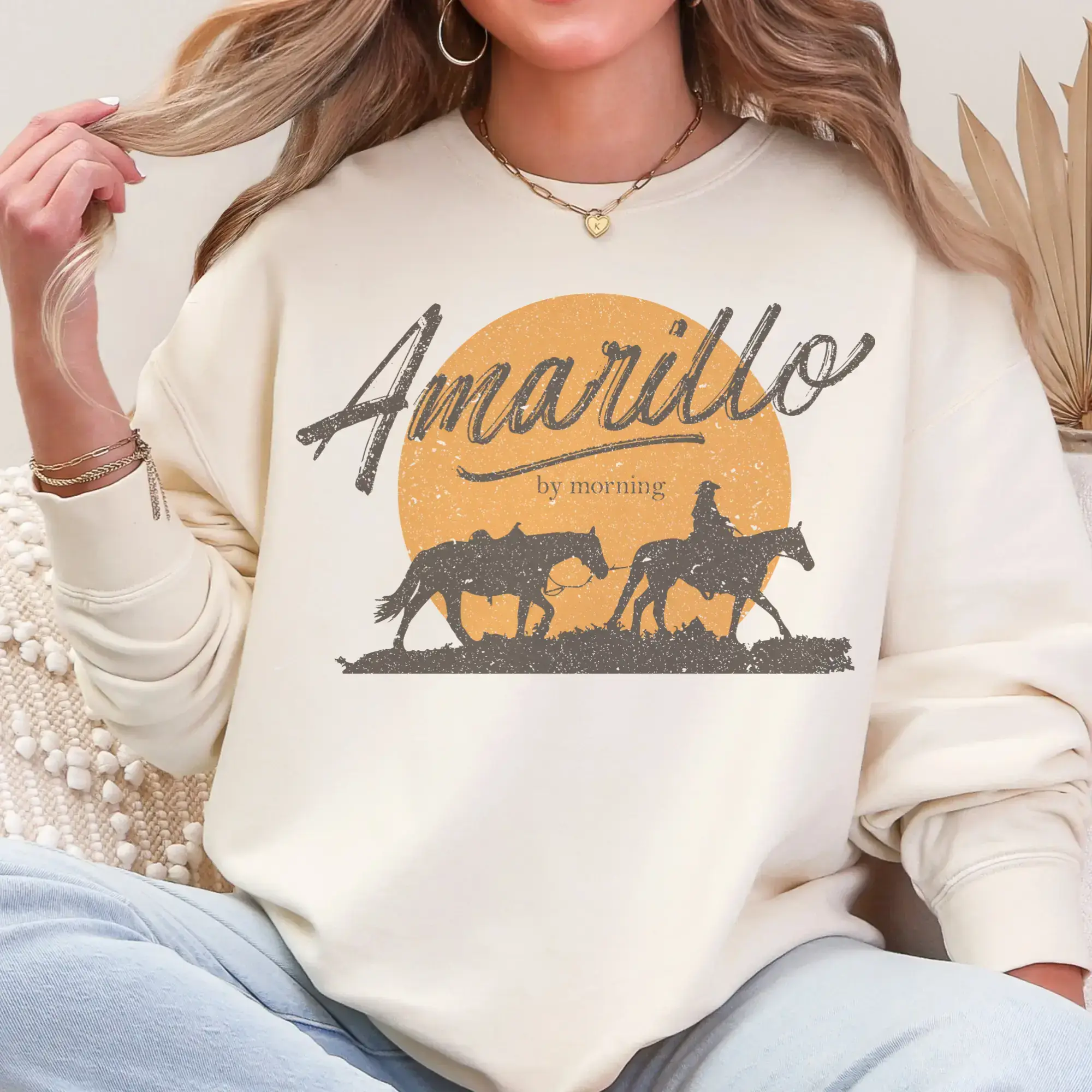 Southwestern vibes meet cozy style This vintage-inspired sweatshirt features a bold Amarillo BOHO graphic, blending classic western charm with laid-back boho flair for everyday cowgirl comfort. Retro Amarillo BOHO western graphic Vintage-style sublimation print Soft, cozy crewneck sweatshirt Unisex fit with a relaxed women’s silhouette Casual pullover perfect for everyday western wear Perfect for ranch days, rodeos, western boutiques, or casual cowgirl style