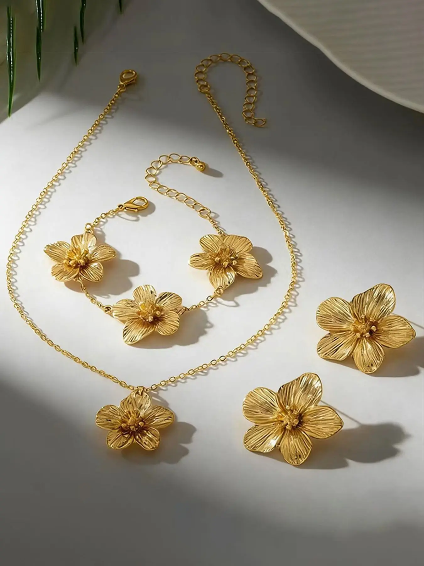 1set Elegant Versatile Geometric Hollow Flower Petal Adjustable Bracelet, Ring, Necklace, Earrings Jewelry Set For Women, Suitable For Daily Wear And Formal Events