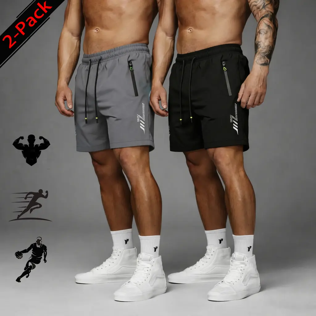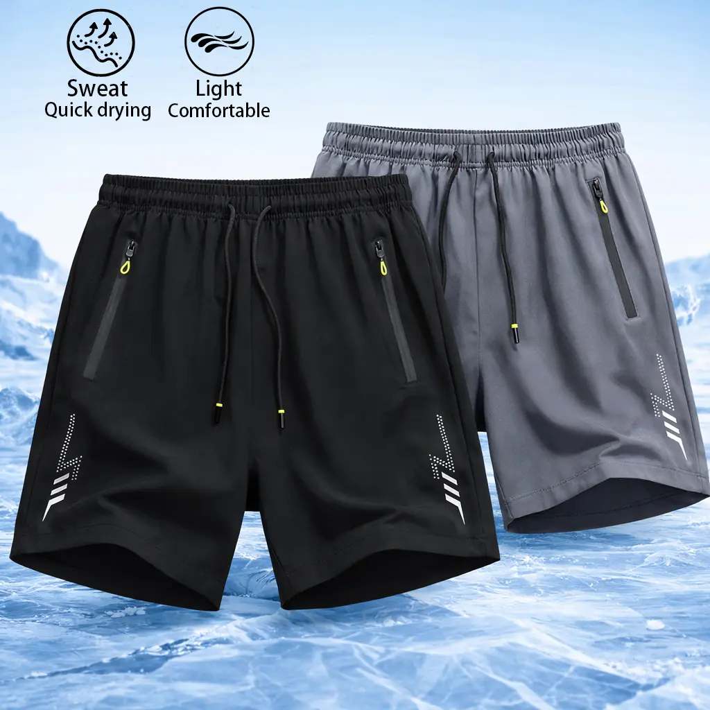 2-pack ice silk quick-dry shorts; men’s casual breathable shorts; men’s lightning print quick-dry shorts. Features an elastic waistband and drawstring design, zippered pockets, and a second-skin feel suitable for various sports activities.