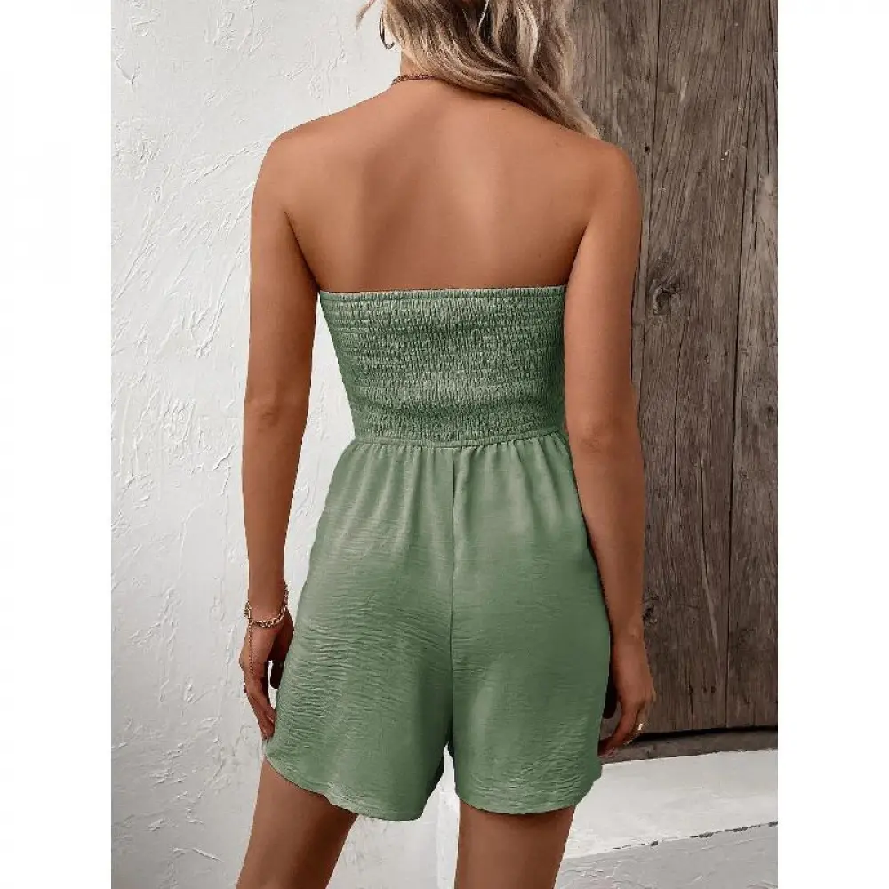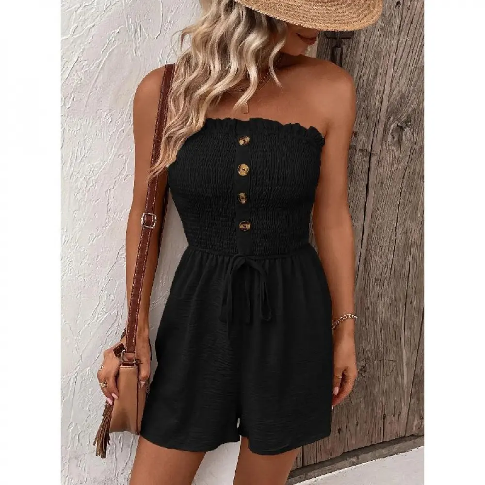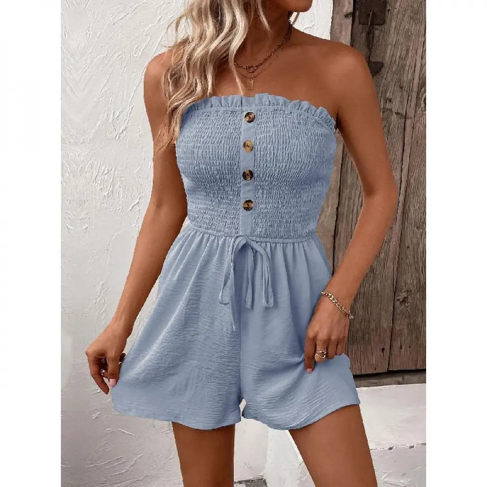 2026 Women'S Plain Frill Trim Shirred Ruched Tie Front Bandeau Romper, Boho Sleeveless Strapless High Waist Jumpsuit For Summer, Summer Outfits 2026, Fashion Casual Women'S Clothing For Daily Wear, Casual Comfy Jumpsuit