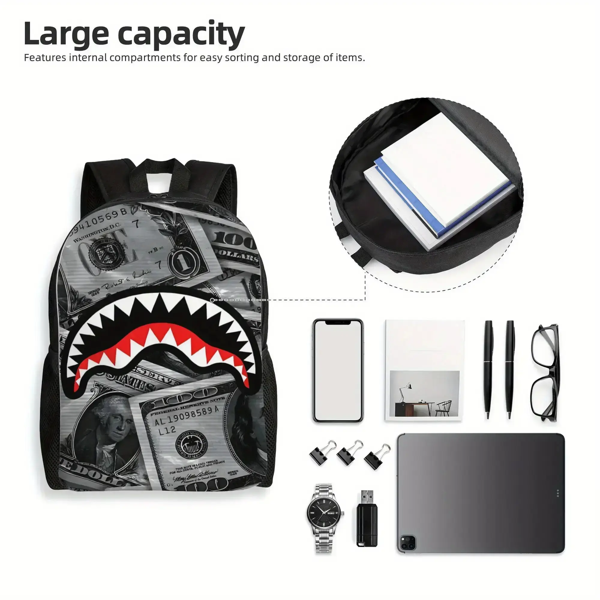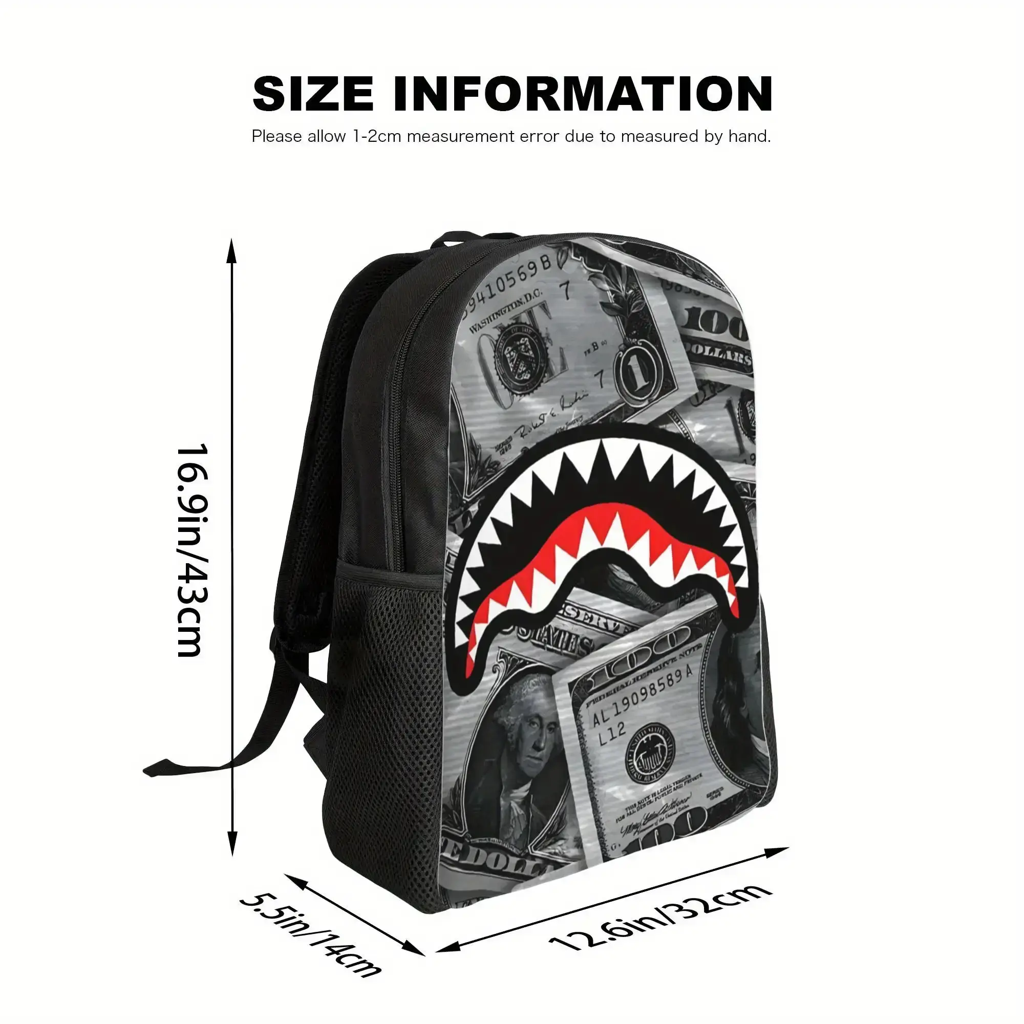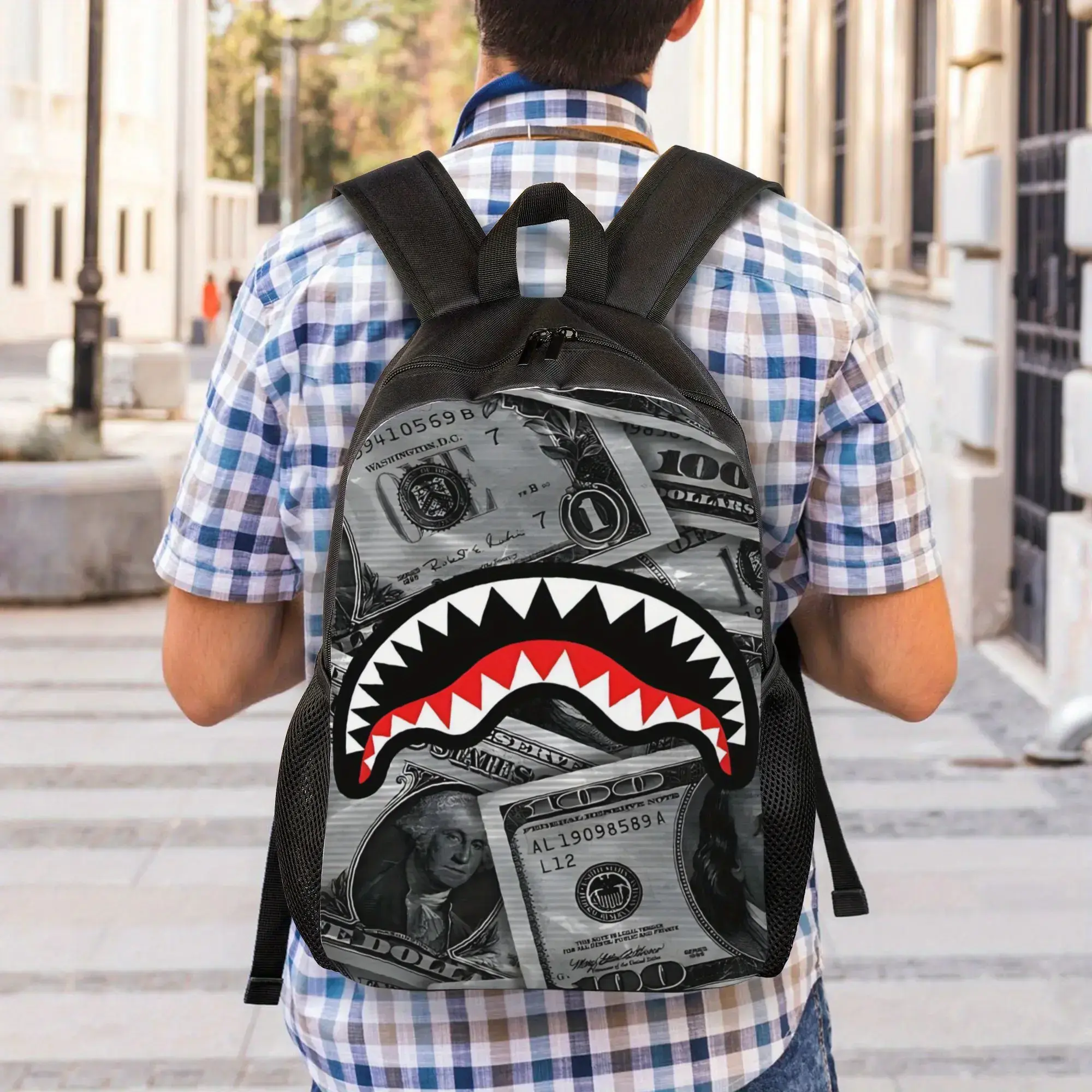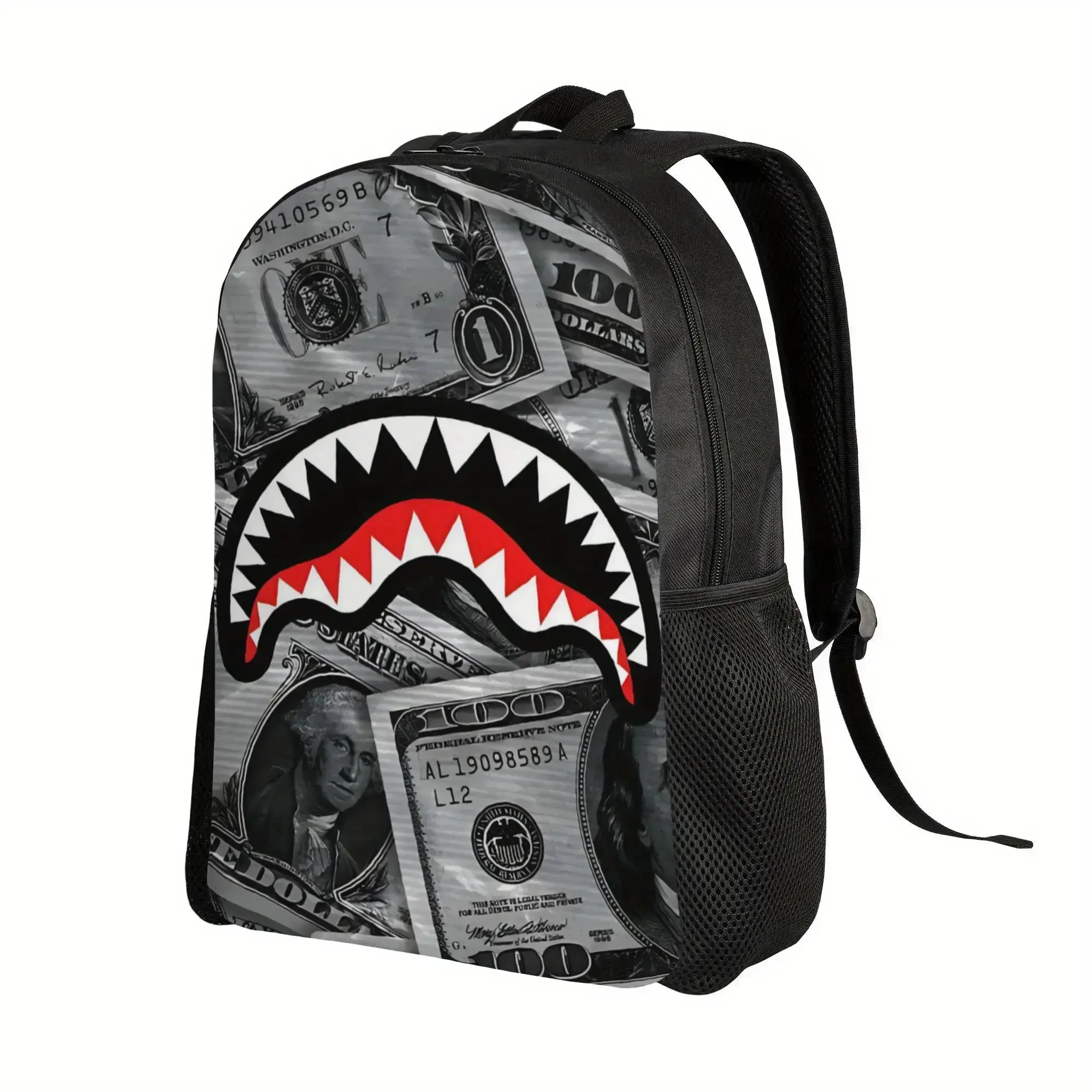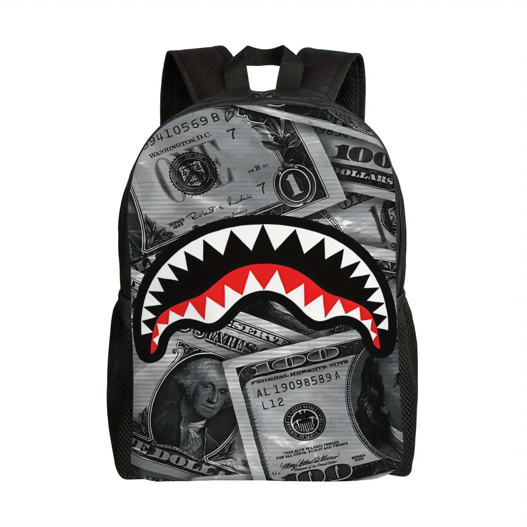 1pc Shark Camouflage Backpack - Black with Red & White Shark Mouth Design, Adjustable Shoulder Straps, Zipper Closure, Durable Polyester Lining, Perfect for College & School, Unique Gift for Men, School Bag, Playful Design, Sturdy Construction
