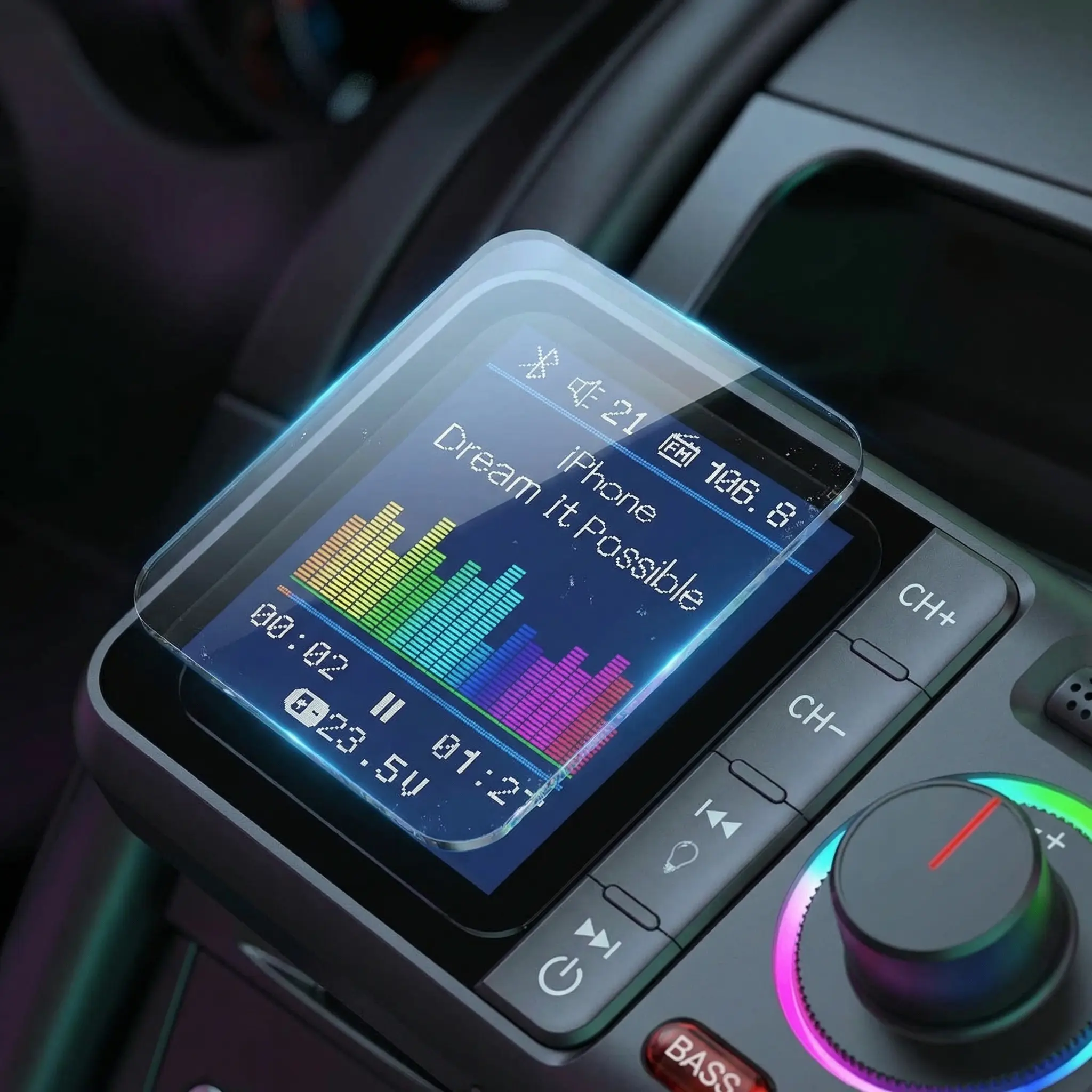 This adapter acts as a wireless music receiver, enhancing your driving experience. It features a colorful display for easy navigation. The QC3.0 Dual USB Fast Charging Port ensures your devices stay powered. No more worrying about battery life during long drives.