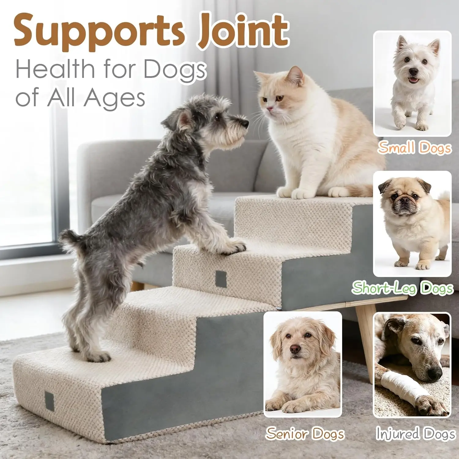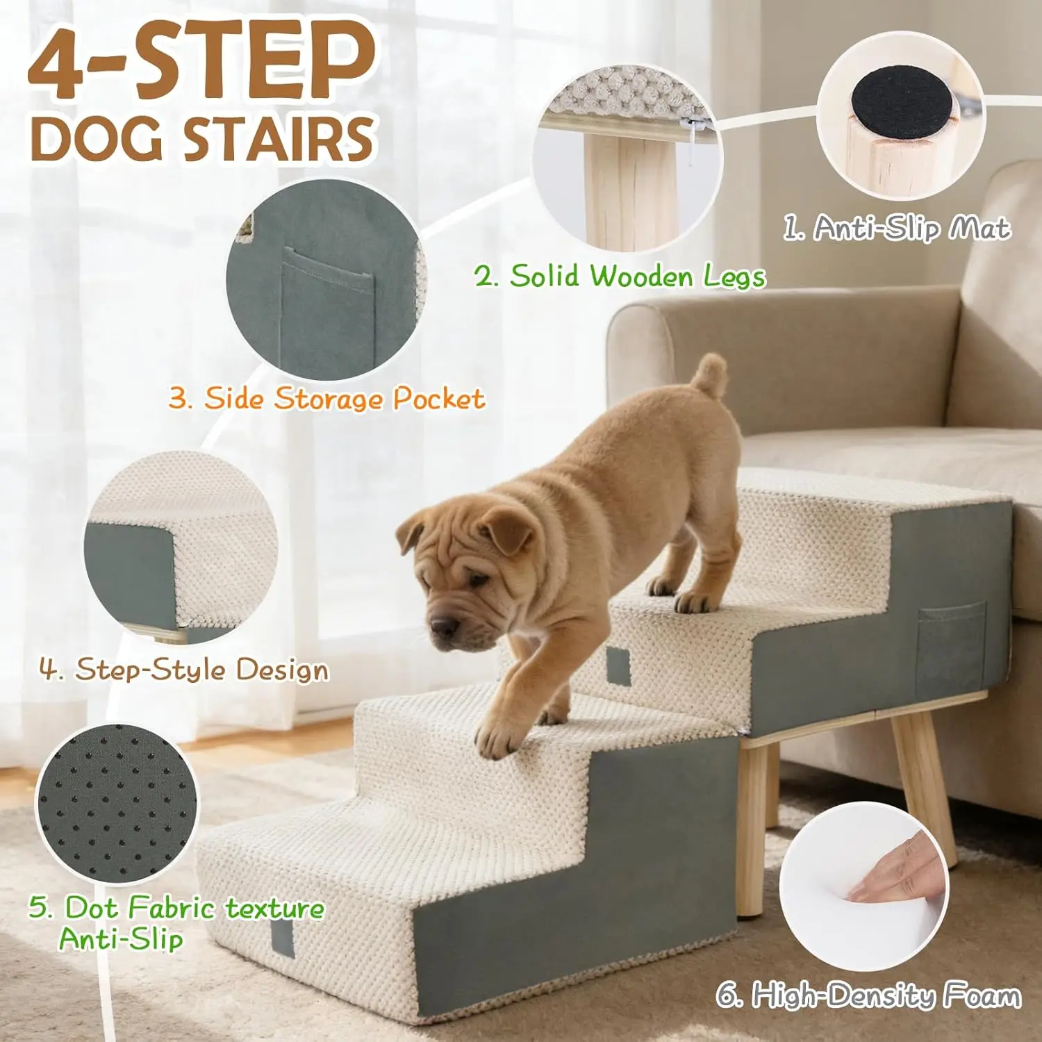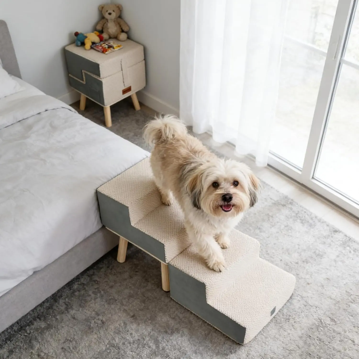 Dog Stairs for Small Dogs and Cats, 4-Step Dog Ramp for Couch and Bed, Foldable 2-in-1 Wooden Pet Steps for Puppy, Split Ottoman Design, Beige