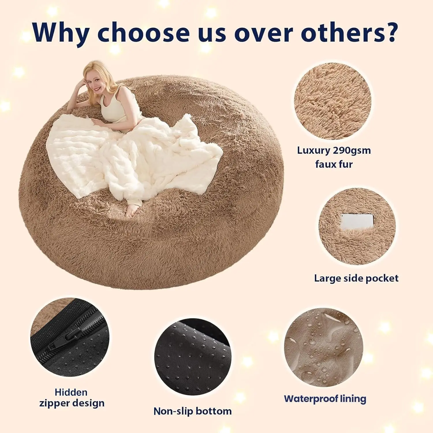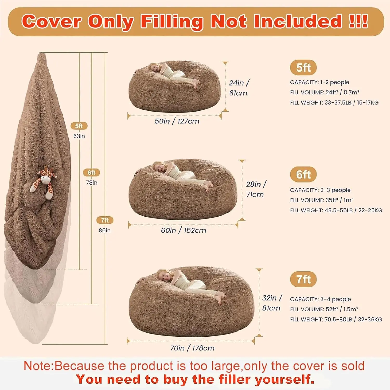 Fluffy Bean Bag for Stuffed Animals Storage, Faux Fur Washable Bean Bag Chair Cover(No Filler) for Textile Plush Toys, Beanbag Chair Cover for Adults Kids Teens, 5FT, Khaki