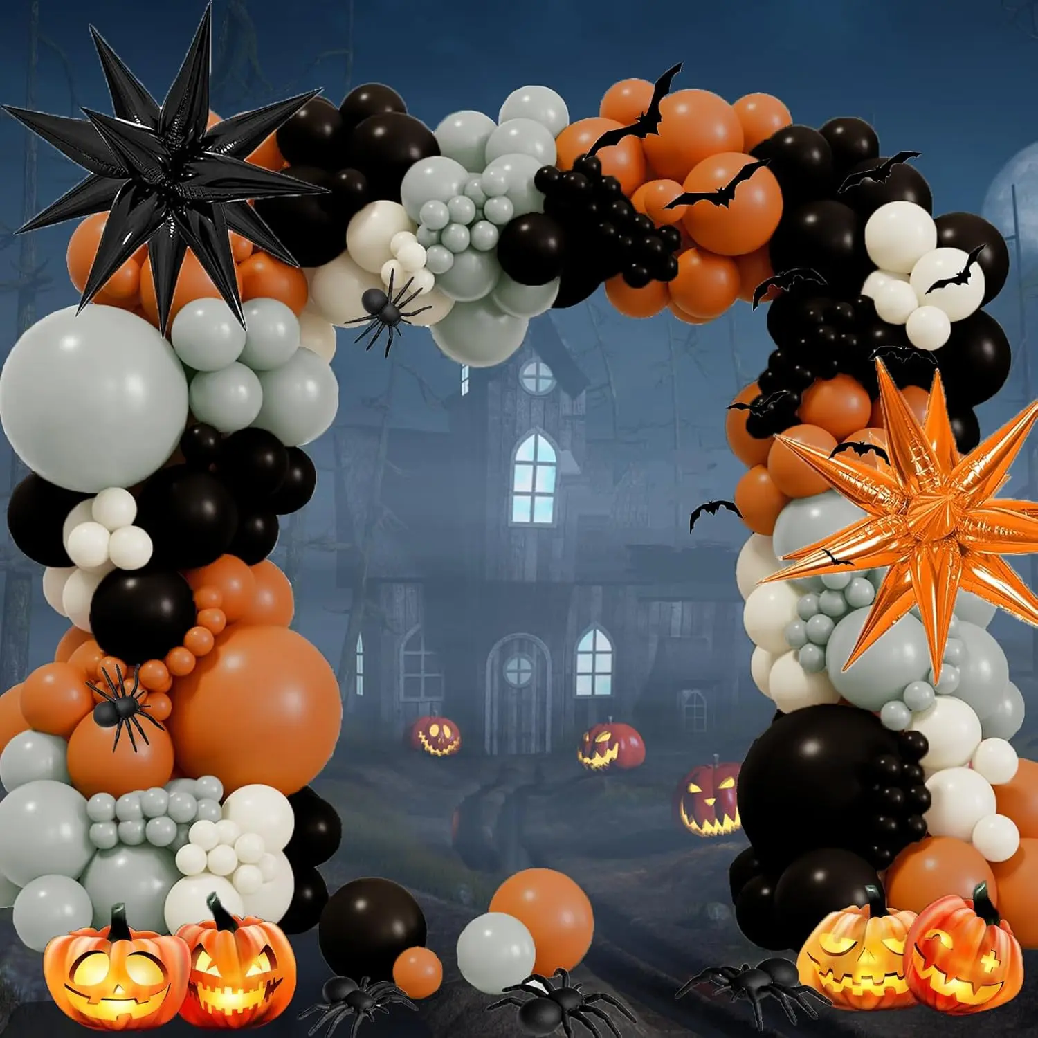 Halloween Balloon Arch Kit - Double Stuffed Orange Black and White Balloons Gray Sand White Star Balloons for Halloween Birthday Party Graduation Father's Day Anniversary Party Decoration