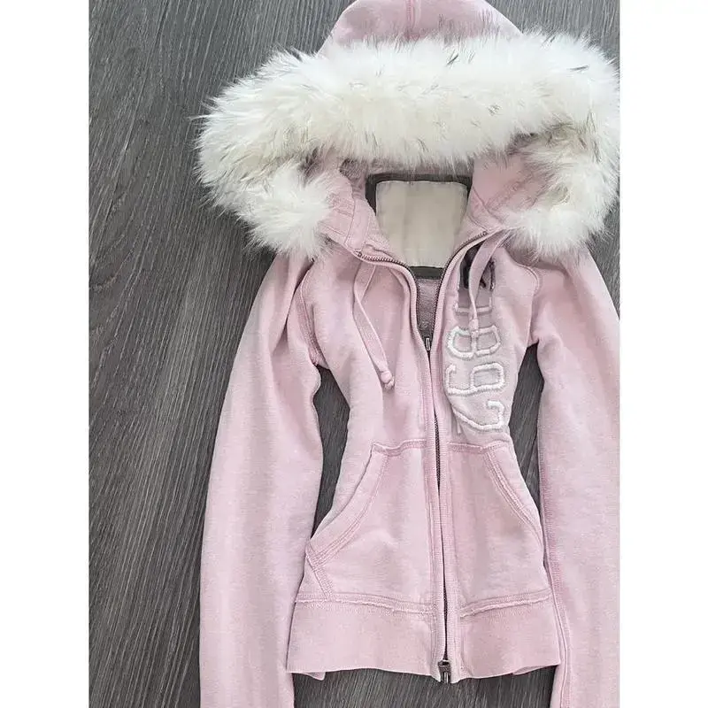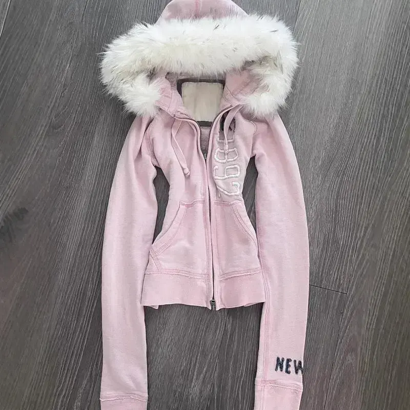 5. Vintage American Pink Faux Fur Hooded Sweatshirt Cinch Waist Y2K Cropped Sweater Alternative Outerwear Can be used with raincoat