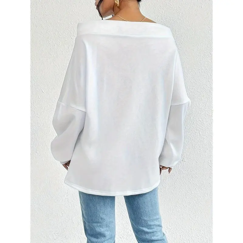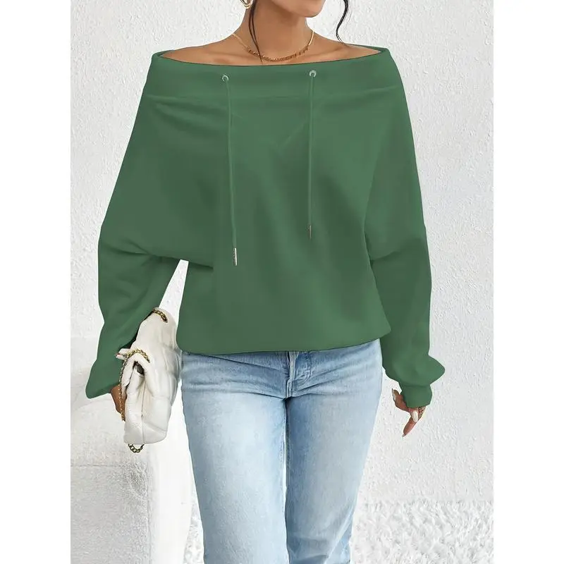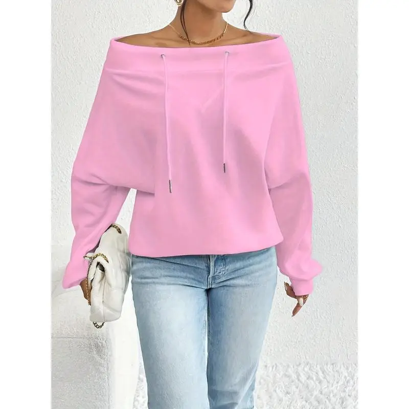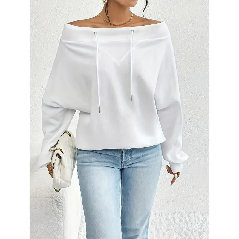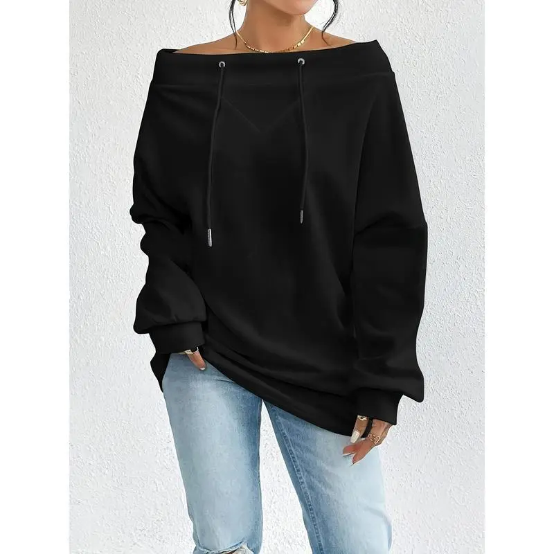 Elegant Style, Women's Casual Off-Shoulder Drawstring Sweatshirt - Fashionable Loose Fit, Solid Color, Long Sleeve, Polyester Blend, Perfect for Autumn/Winter Womenswear Hoodie Tops Pullover Basic Black Fitted MinimalistGift