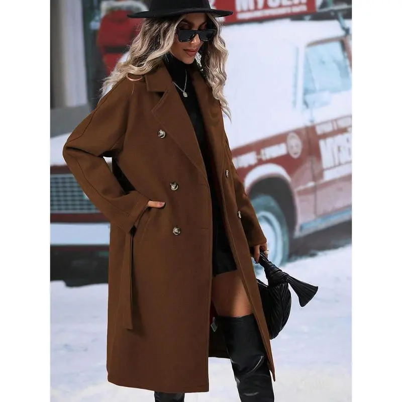 Womens Long Wool Pea Coat Notched Lapel Double Breasted Trench Coat Winter Warm Overcoat with Belt Womenswear JacketsGiftGift