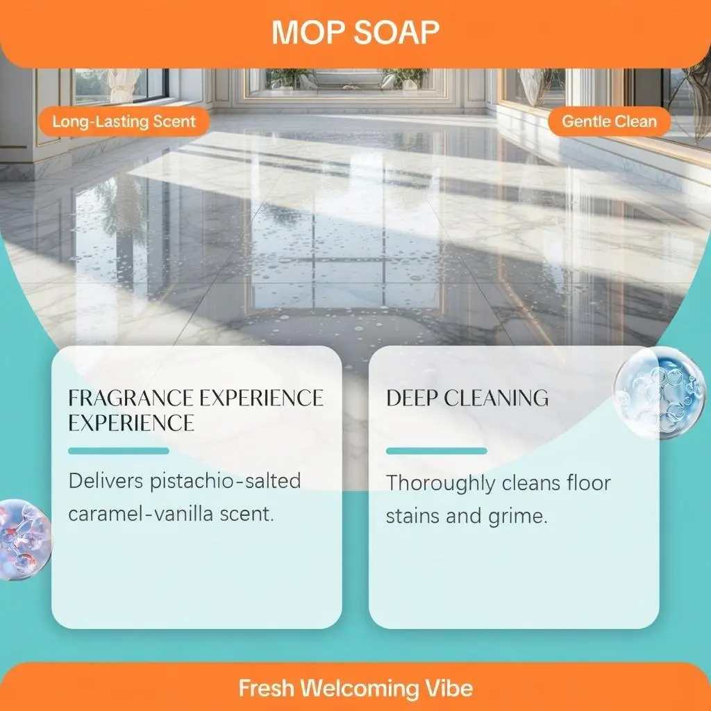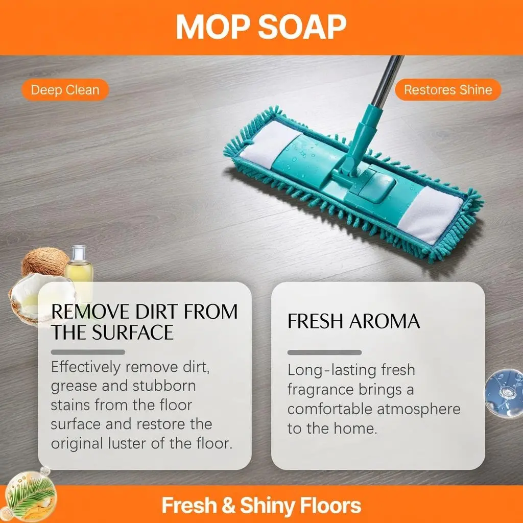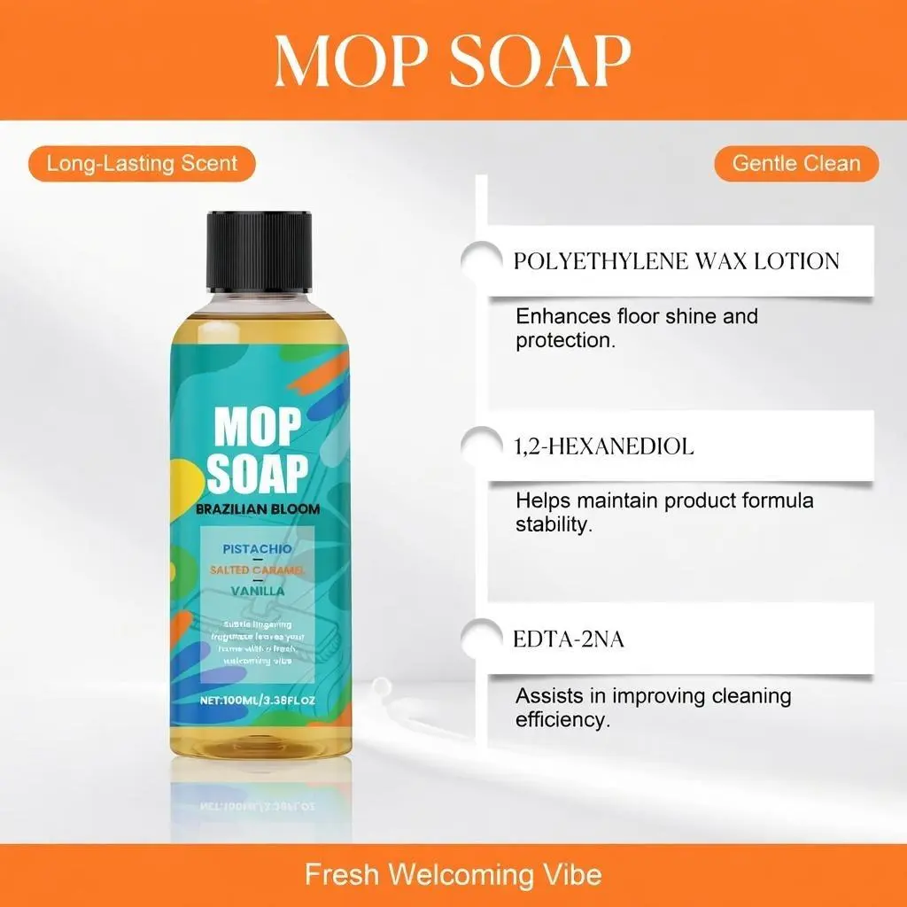Our scented mop soap cleaning solution is carefully formulated with PEG-12 dimethicone cross-linked polymer and polyethylene wax emulsion