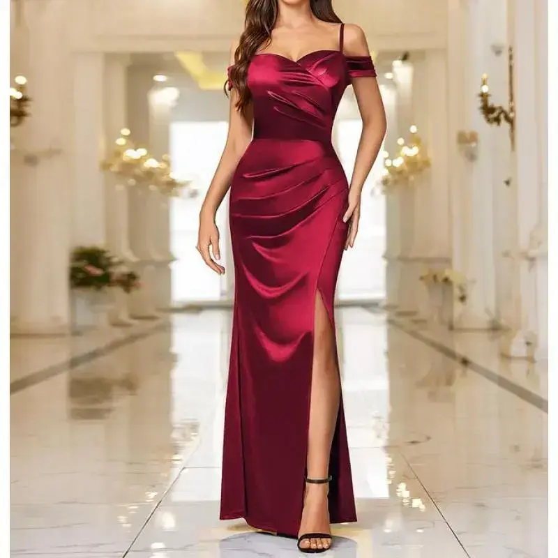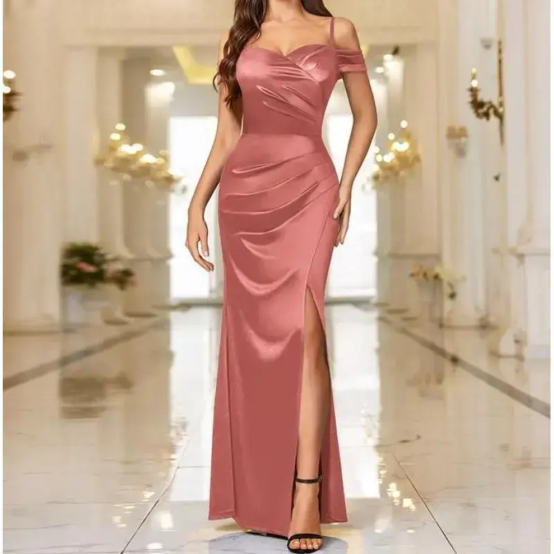 Women'sOffShoulderSleevelessSatinHighSplitWrapRuchedStyleFormalEveningPartyMaxiDressWomenswearSpaghettiStrapweddingguestgraduationbridesmaiddresses