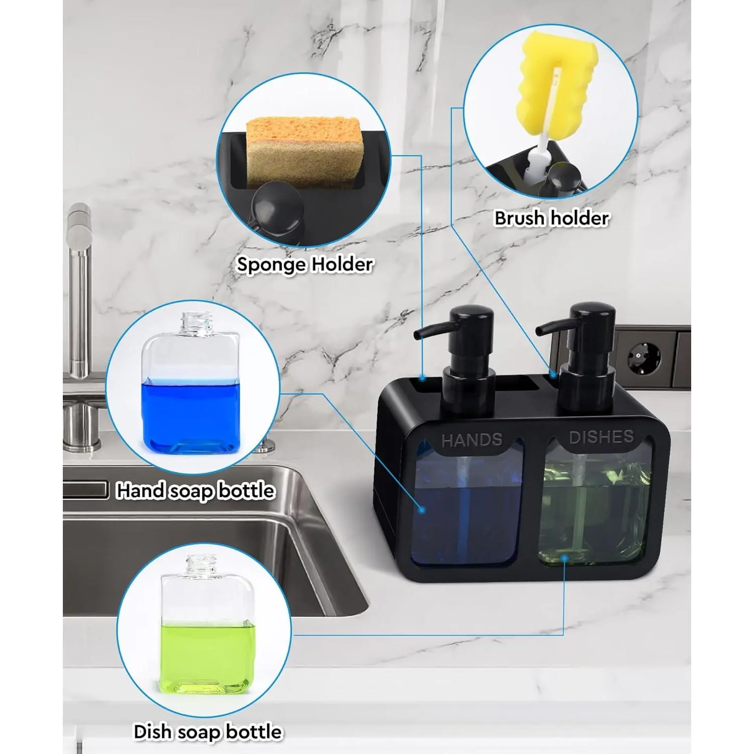 Kitchen Hand Soap and Dish Soap Dispenser Set, Dual Soap Dispenser with Sponge Caddy and Brush Holder 4-in-1 Organizer for Kitchen Sink Countertop, Useful Kitchen Gadgets - Black