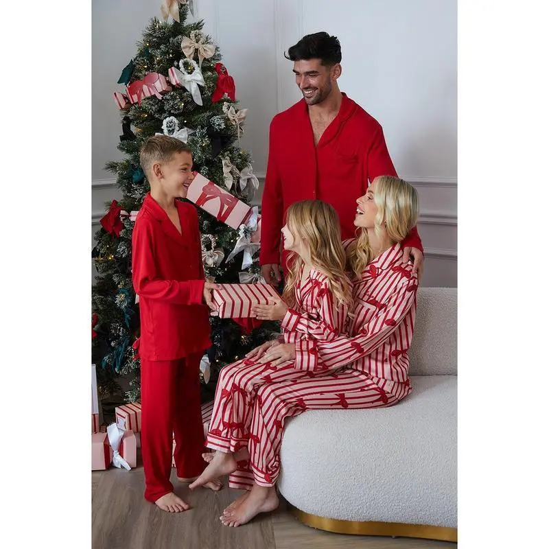 Family Matching Pajama Set Lapel Neck Button-up Long Sleeve Tops Long Pants 2-Piece Bow/Solid Color Loungewear Outfit ? Men (cm/inch) S Tops Length: 69/27.17 Bust: 106/41.73 Pants Length: 104.5/41.14 Waist: 68/26.77 M Tops Length: 71/27.95 Bust: 111/43.7 Pants Length: 106/41.73 Waist: 73/28.74 L Tops Length: 73/28.74 Bust: 117/46.06 Pants Length: 107.5/42.32 Waist: 78/30.71 XL Tops Length: 75/29.53 Bust: 123/48.43 Pants Length: 109/42.91 Waist: 83/32.68 XXL Tops Length: 76/29.92 Bust: 129/50.79 Pants Length: 110.5/43.5 Waist: 88/34.65 XXXL Tops Length: 77/30.31 Bust: 135/53.15 Pants Length: 111.5/43.9 Waist: 93/36.61 ? Women (cm/inch) S Tops Length: 62/24.41 Bust: 98/38.58 Pants Length: 103/40.55 Waist: 64/25.2 M Tops Length: 63/24.8 Bust: 102/40.16 Pants Length: 104.5/41.14 Waist: 68/26.77 L Tops Length: 64/25.2 Bust: 108/42.52 Pants Length: 106/41.73 Waist: 73/28.74 XL Tops Length: 65/25.59 Bust: 114/44.88 Pants Length: 107/42.13 Waist: 78/30.71 XXL Tops Length: 66/25.98 Bust: 120/47.24 Pants Length: 108/42.52 Waist: 83/32.68 XXXL Tops Length: 67/26.38 Bust: 126/49.61 Pants Length: 109/42.91 Waist: 89/35.04 ? Kid (cm/inch) 3T Tops Length: 38/14.96 Bust: 64.5/25.39 Pants Length: 54/21.26 Waist: 42/16.54 Advised Age: 3 Years 4T Tops Length: 40/15.75 Bust: 67/26.38 Pants Length: 59/23.23 Waist: 44/17.32 Advised Age: 4 Years 6T Tops Length: 45/17.72 Bust: 72.5/28.54 Pants Length: 69/27.17 Waist: 48/18.9 Advised Age: 6 Years 8T Tops Length: 51/20.08 Bust: 79.5/31.3 Pants Length: 79/31.1 Waist: 51/20.08 Advised Age: 8 Years 10T Tops Length: 57/22.44 Bust: 86.5/34.06 Pants Length: 89/35.04 Waist: 54/21.26 Advised Age: 10 Years 12T Tops Length: 62/24.41 Bust: 93.5/36.81 Pants Length: 98/38.58 Waist: 58/22.83 Advised Age: 12 Years ? Specifications: Material: 100% Elastane Pattern: Bow/Solid Color Sleeve: Long Sleeve Style: Fashion Applicable Occasion: Indoor, Outdoor ? Package Contents 1 Pajama Set (1 Tops + 1 Long Pants) ? Note: 1. Due to manual measurement, there may be an error of 1-2 cm in size. 2. Depending on the computer monitor used, colors may differ from actual colors. 3. Please wash dark and light colored clothes separately to avoid staining. ? Promise If the product has any quality problems, please let us know, we will help you solve the problem as quickly as possible.