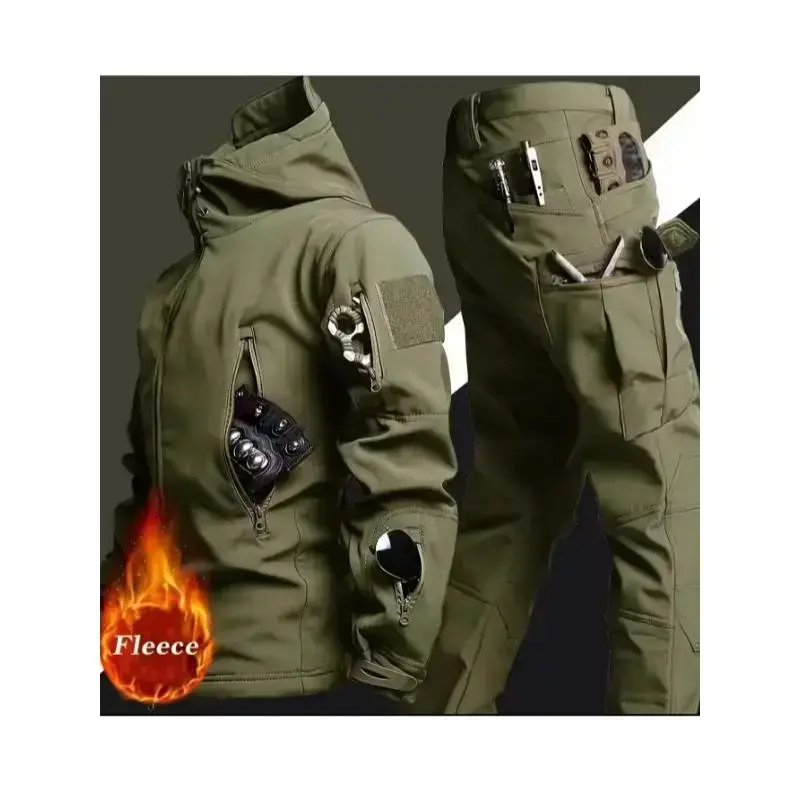 Men'S Two-Piece Tactical Outfit, Featuring a Lined Hooded Jacket And Pants, Designed to Be Windproof, Waterproof, And Durable, Equipped with Multiple Pockets, Suitable for Outdoor Activities in Autumn And Winter.