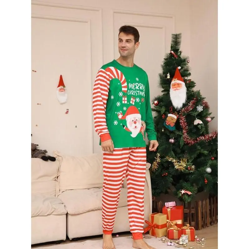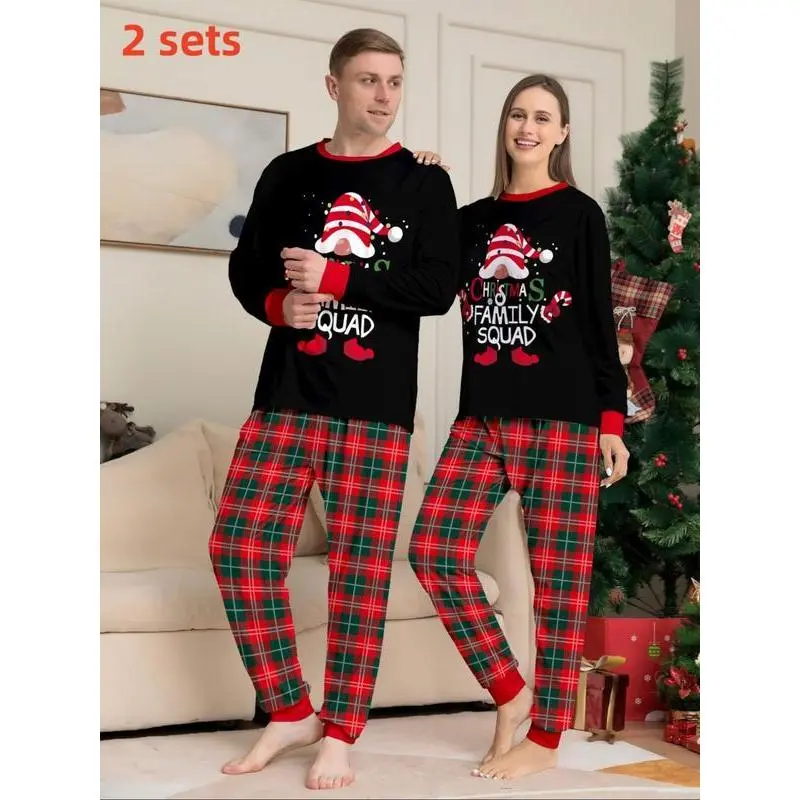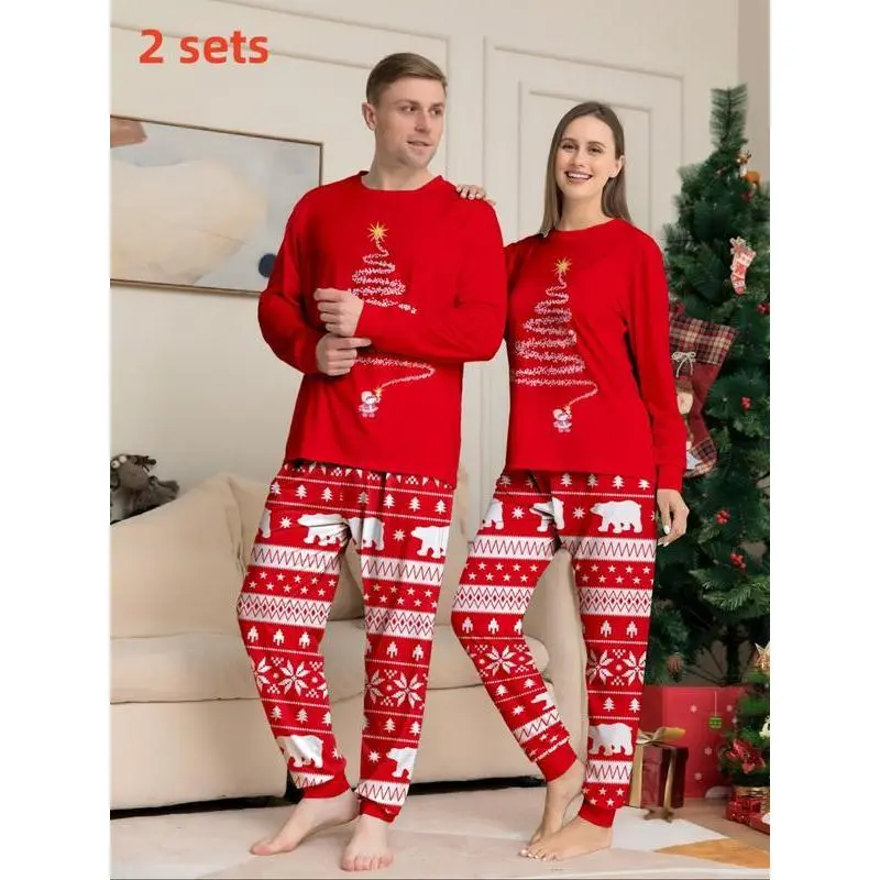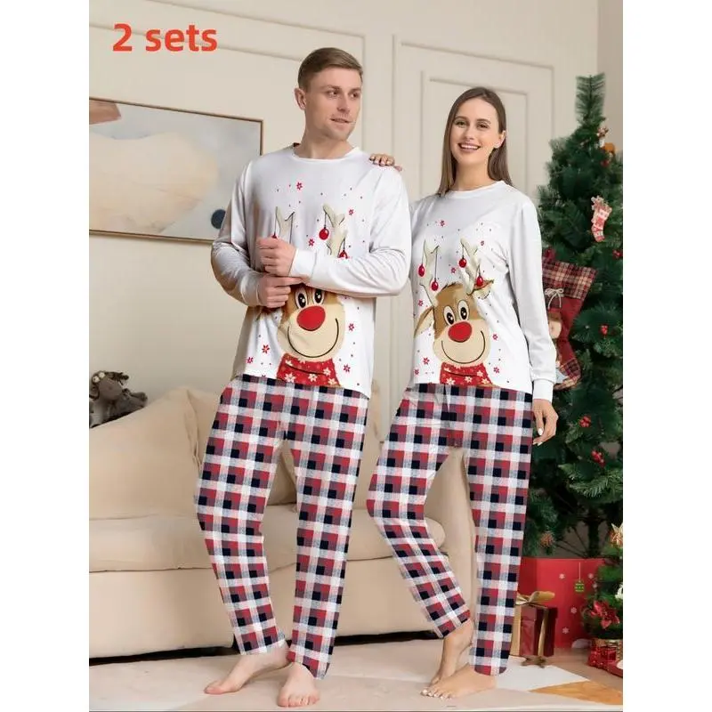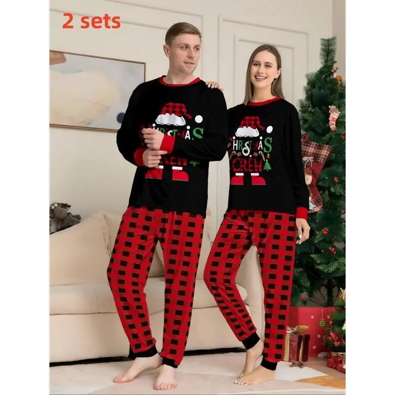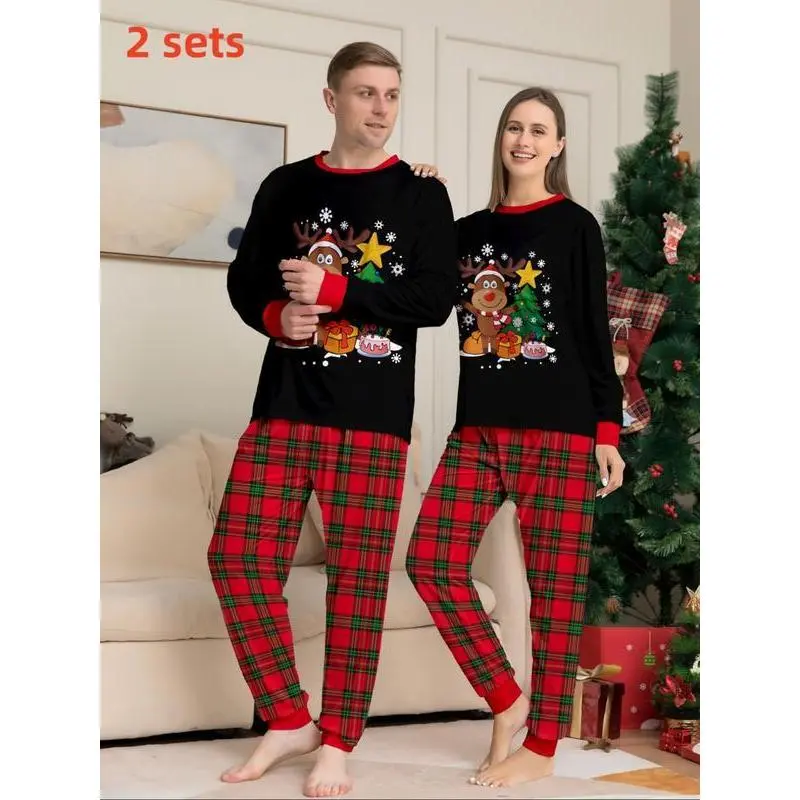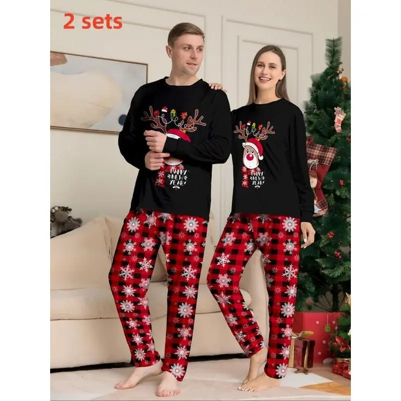 Couple's Christmas Themed Print Pajama Two-piece Set, Casual Comfy Long Sleeve Top & Elastic Waist Pants PJ Set, Men's Sleepwear for Spring & Fall, LoungewearGift