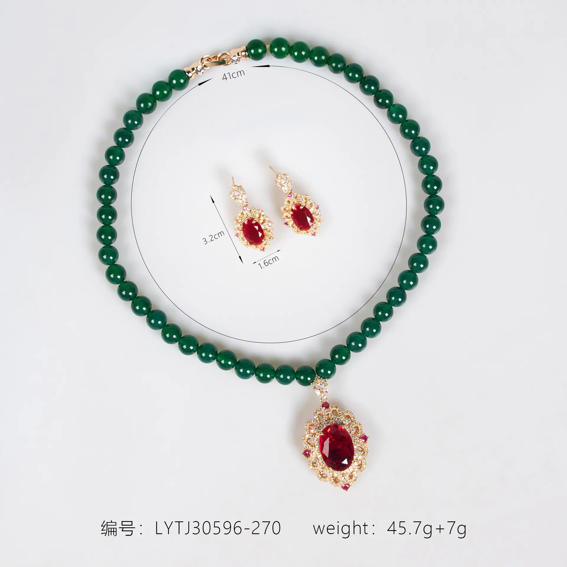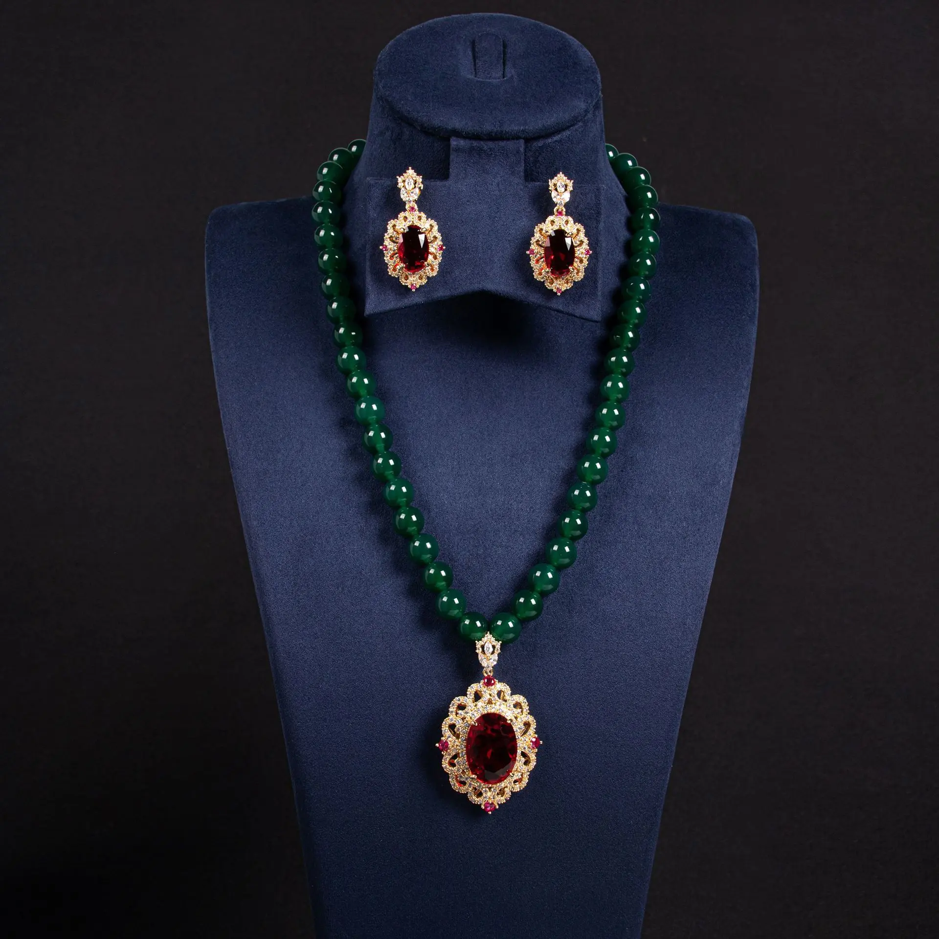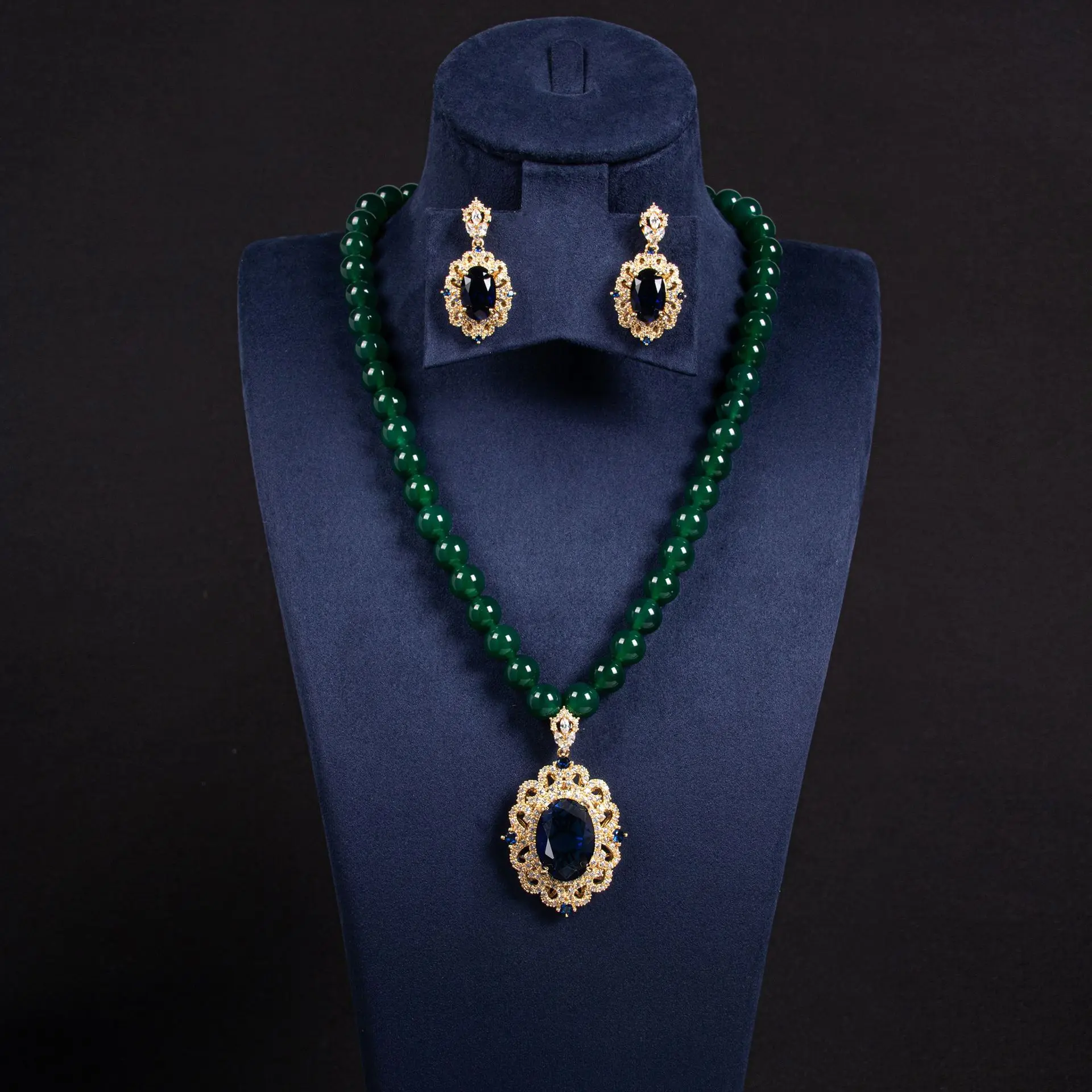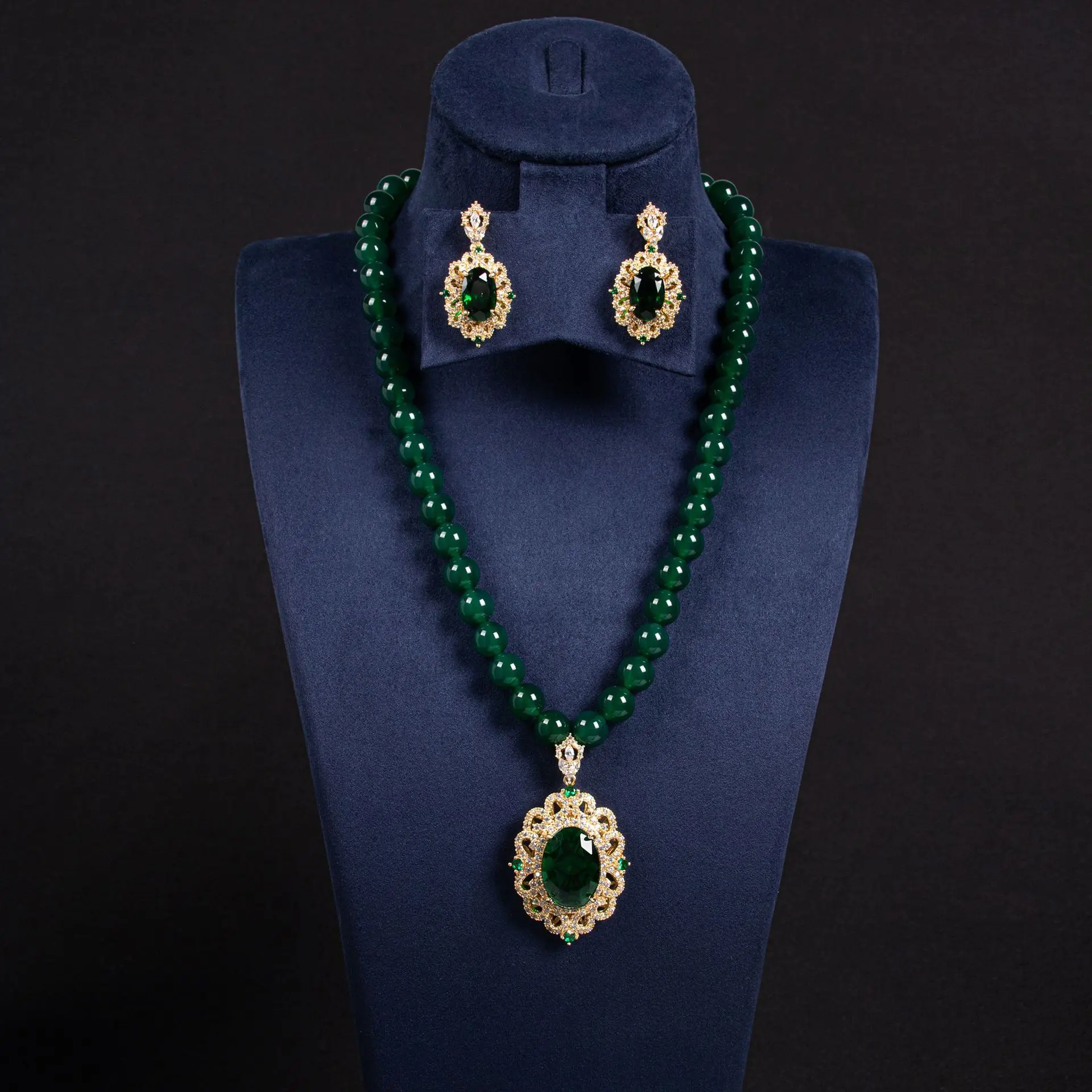 Luxurious Emerald Beaded Agate Necklace with Zircon Inlay and Earrings Set for Women, Versatile Niche Jewelry