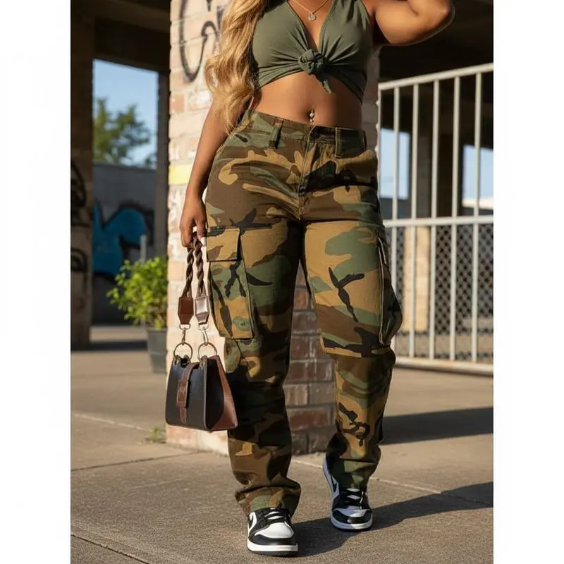 Women's Camo Cargo Pants Wide Leg Camouflage Army Fatigue Sweatpants with Flap Pockets Streetwear In Women's FashionGift
