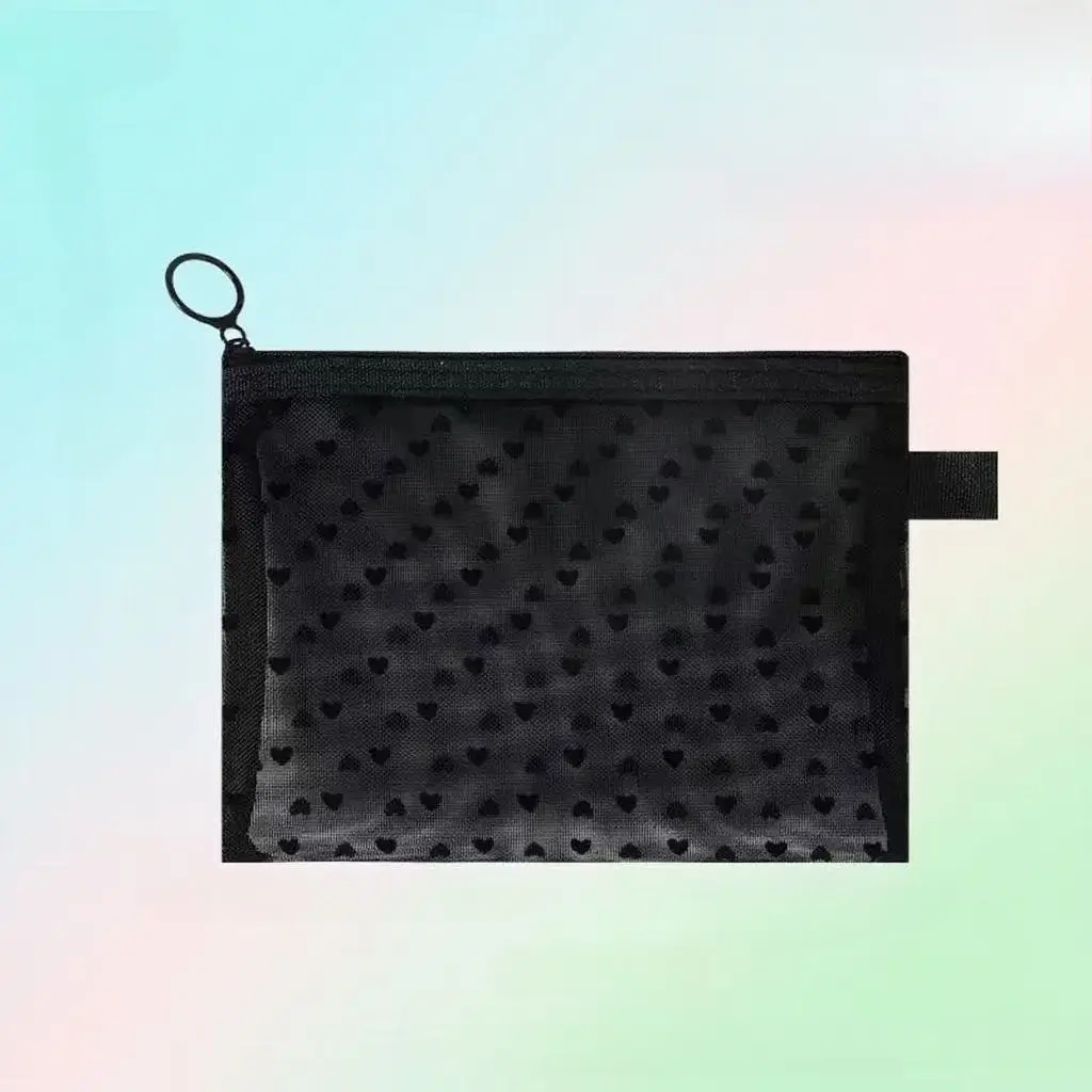 【Large Capacity】: This heart-shaped mesh makeup bag offers ample space for all your essentials, perfect for travel.