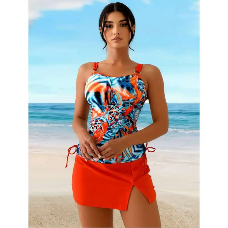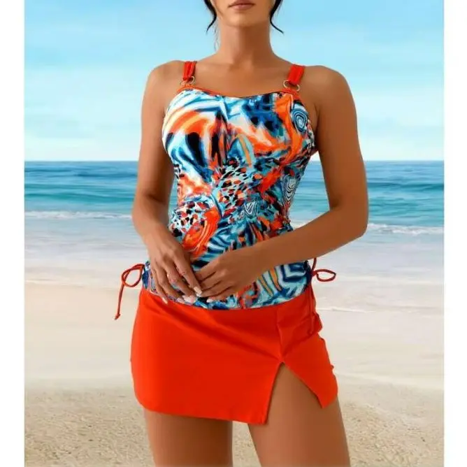 Make a splash this summer with our stylish Corset Tankini Top and Orange Split Skirt swimsuit set. This two-piece bathing suit features a captivating abstract print, offering a modern and eye-catching look. The corset-style tankini top provides a flattering and supportive fit, enhancing your natural curves. The adjustable shoulder straps allow for a customized and comfortable experience. The high-waisted split skirt adds a touch of elegance and sophistication, while offering moderate coverage. Crafted from a soft, quick-drying fabric blend 82% Nylon and 18% Spandex ensuring both comfort and durability. Available in sizes S, M, L, and XL. The tankini top includes removable bra pads for adjustable support. Hand wash recommended; lay flat to dry. Perfect for beach vacations, poolside lounging, or any water activity. Enjoy a confident and fashionable swimwear experience with this vibrant andset. Skirt length measures approximately 31 inches. The split design offers freedom of movement and a flattering silhouette. This swimsuit set is designed to make you feel beautiful and comfortable all day long. Eye-Catching Design: Features a vibrant abstract print on a corset-style tankini top and a complementary orange split skirt; creates a fashionable and modern swimwear look perfect for summer; ideal for those seeking a bold andstyle statement Comfortable & Supportive: The tankini top is crafted from a soft and stretchy fabric blend (82% Nylon, 18% Spandex) offering excellent comfort and support; includes removable bra pads for customizable coverage and adjustable shoulder straps for a personalized fit; sizes available are S, M, L, and XL Flattering Silhouette: The high-waisted split skirt design accentuates the waistline and provides moderate coverage; the split detail allows for easy movement and adds a touch of elegance; skirt length is approximately 31 inches, suitable for various body types Quick-Drying Fabric: Constructed with a quick-drying fabric blend ensuring a comfortable experience after swimming or water activities; lightweight and breathable material prevents overheating; ideal for extended wear during beach days or poolside relaxation Versatile Swimwear: Suitable for various water activities such as swimming, sunbathing, beach volleyball, or simply lounging by the pool; this two-piece swimsuit set is a versatile addition to your summer wardrobe; hand wash recommended and lay flat to dry for optimal care