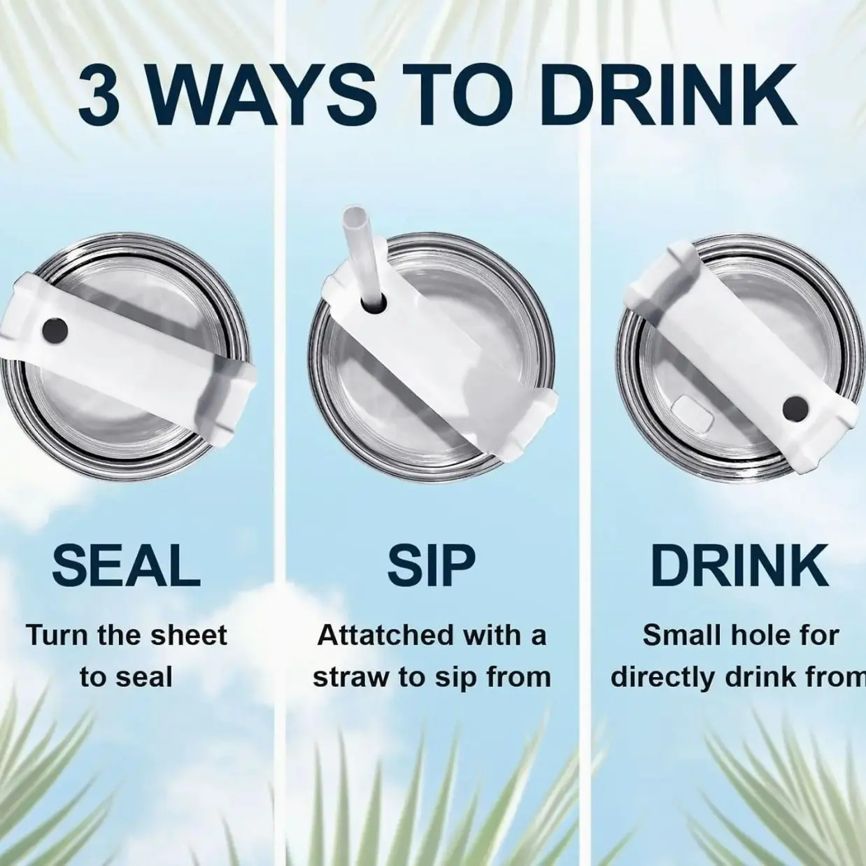 Advanced 3-Way Rotating Lid The versatile lid gives you options: use the included reusable straw for easy sipping, use the wide-mouth opening for chugging, or rotate it to the full-cover top to prevent splashes and spills.