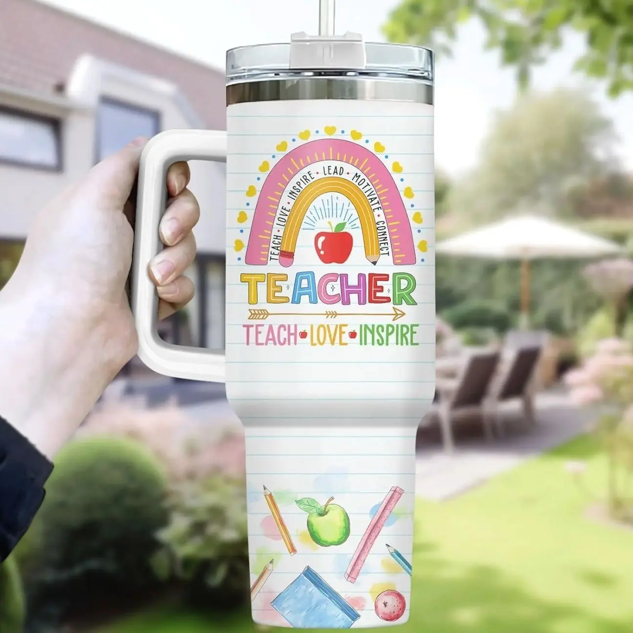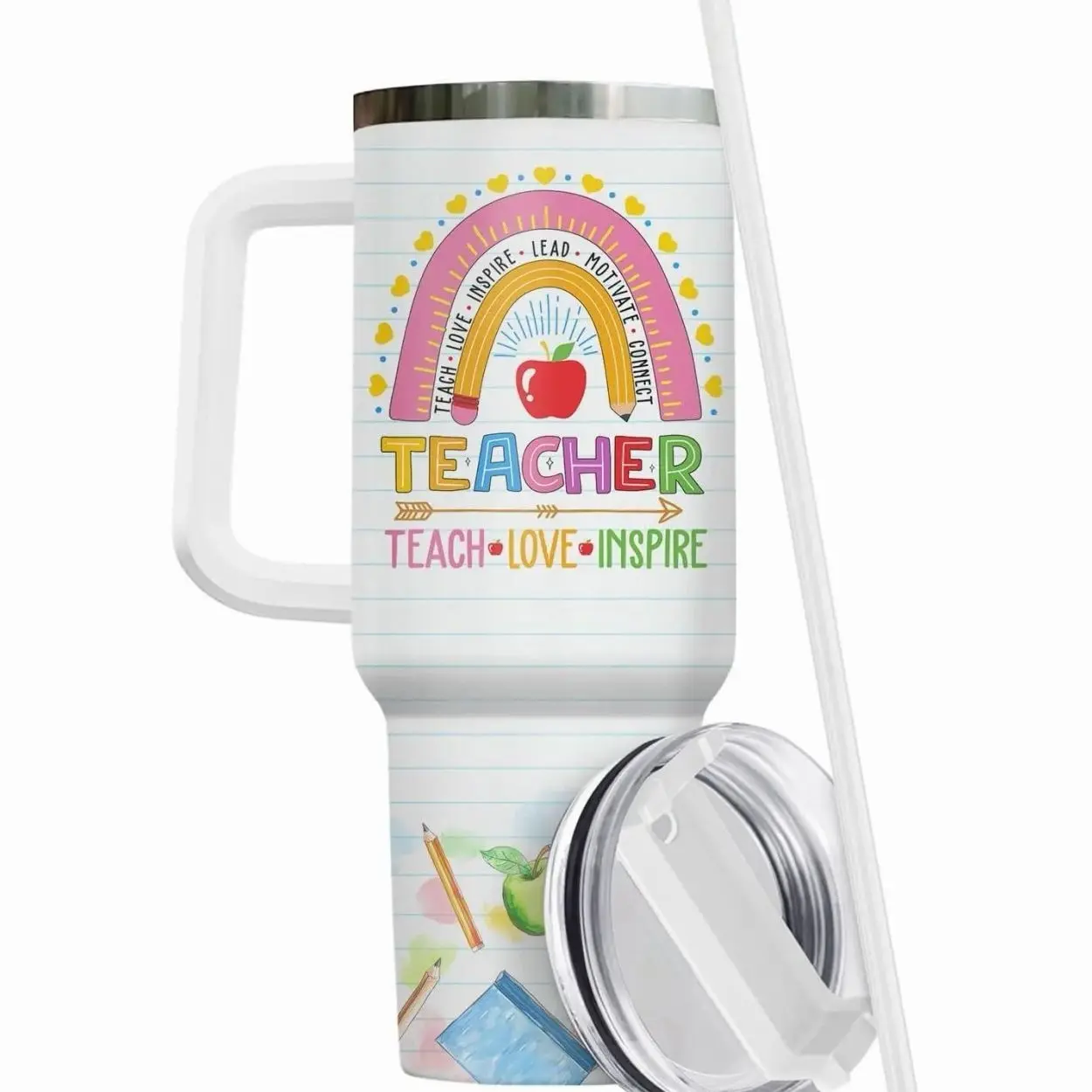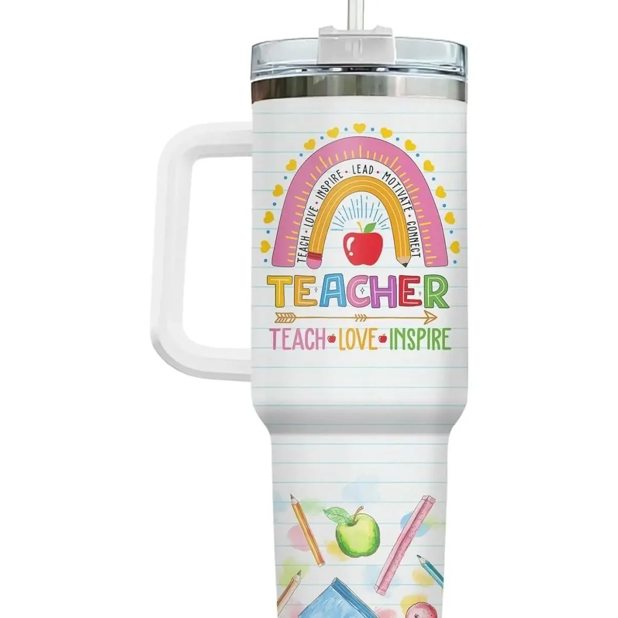 5. Teacher Appreciation Tumbler, 40oz Teach Love Inspire Rainbow Pencil Design Coffee Cup, Funny You Are Kind Brave Smart Quote, Steel Cup for Educators and School Staff, Kitchen Drinkware, Gift for Teacher
