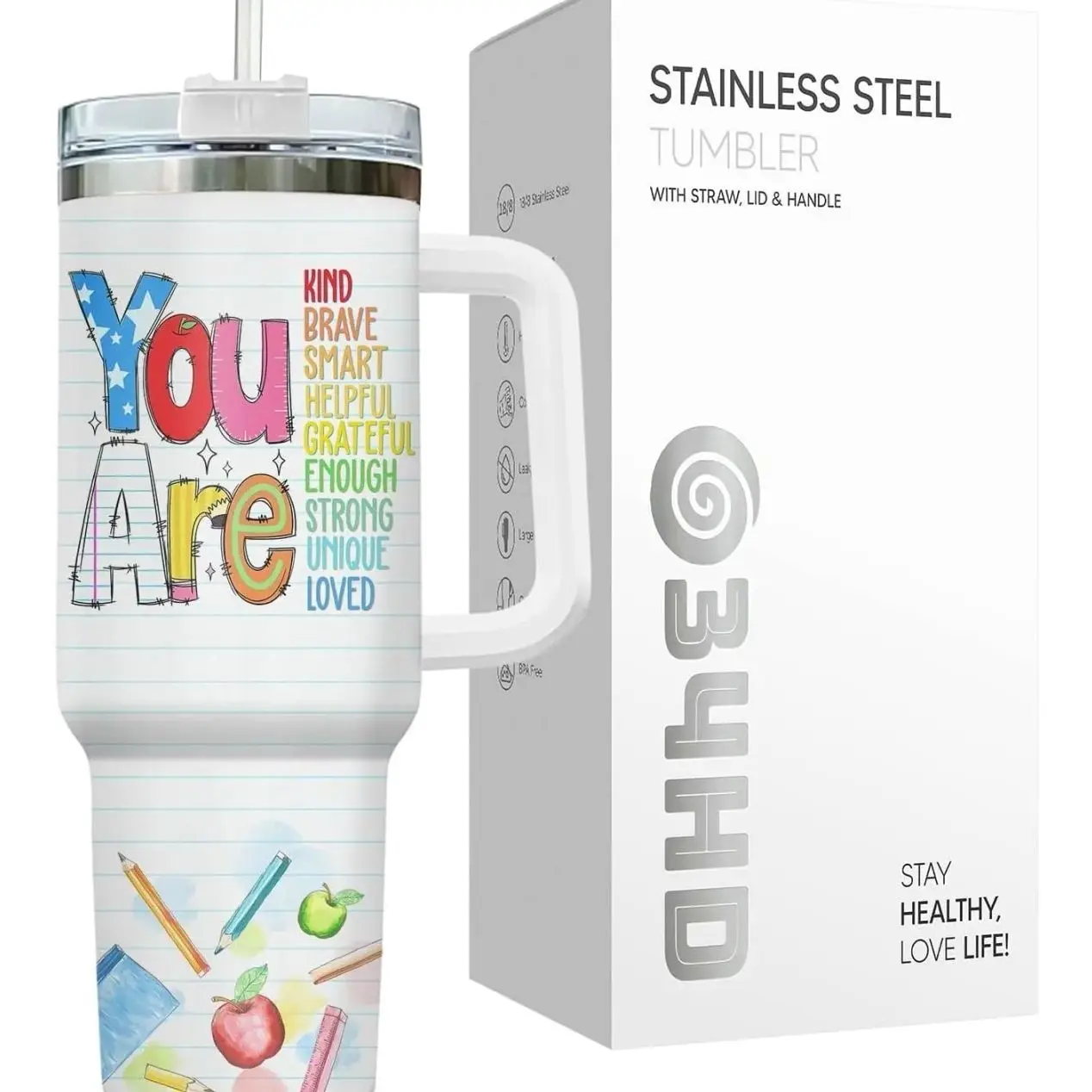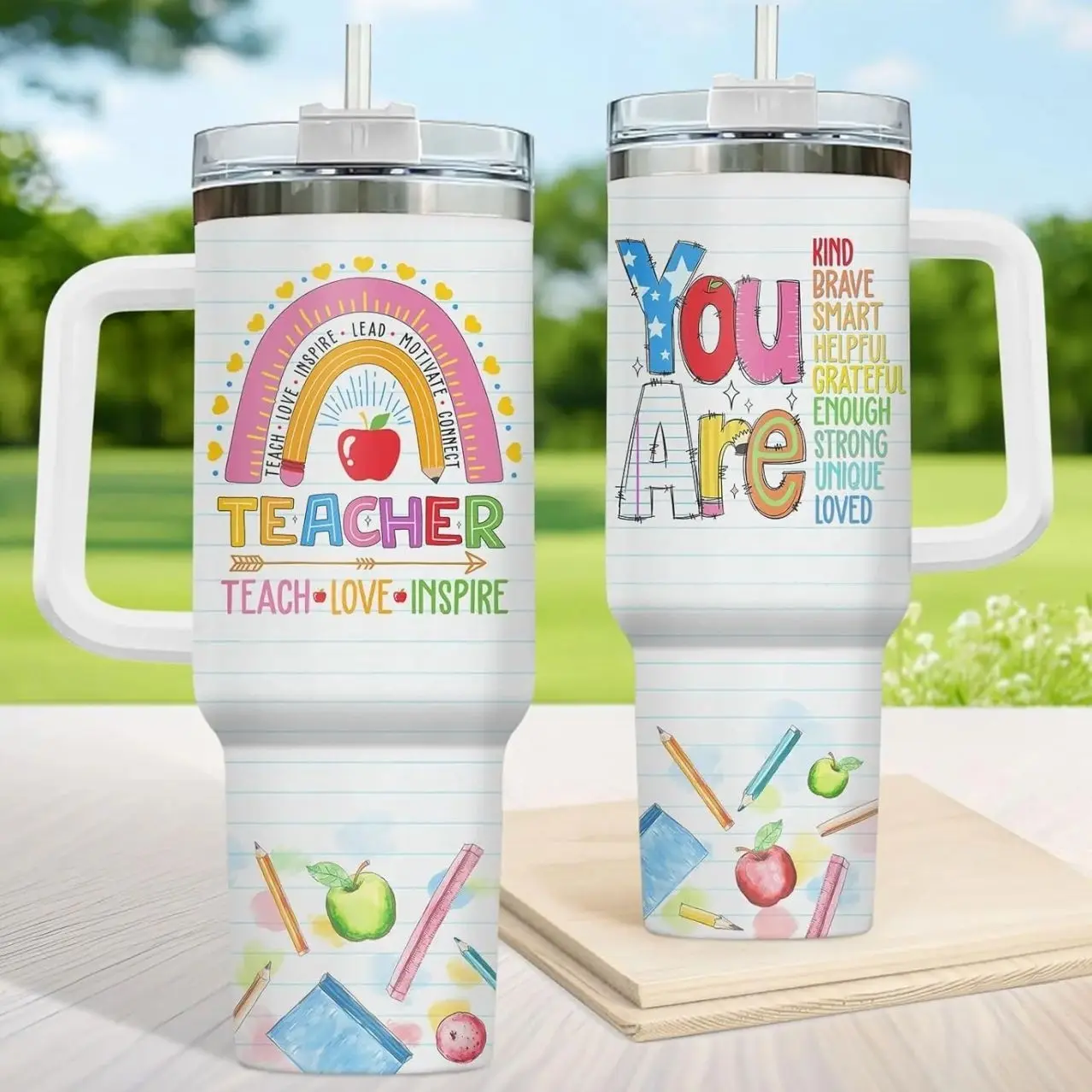 Teacher Appreciation Tumbler, 40oz Teach Love Inspire Rainbow Pencil Design Coffee Cup, Funny You Are Kind Brave Smart Quote, Steel Cup for Educators and School Staff, Kitchen Drinkware, Gift for Teacher